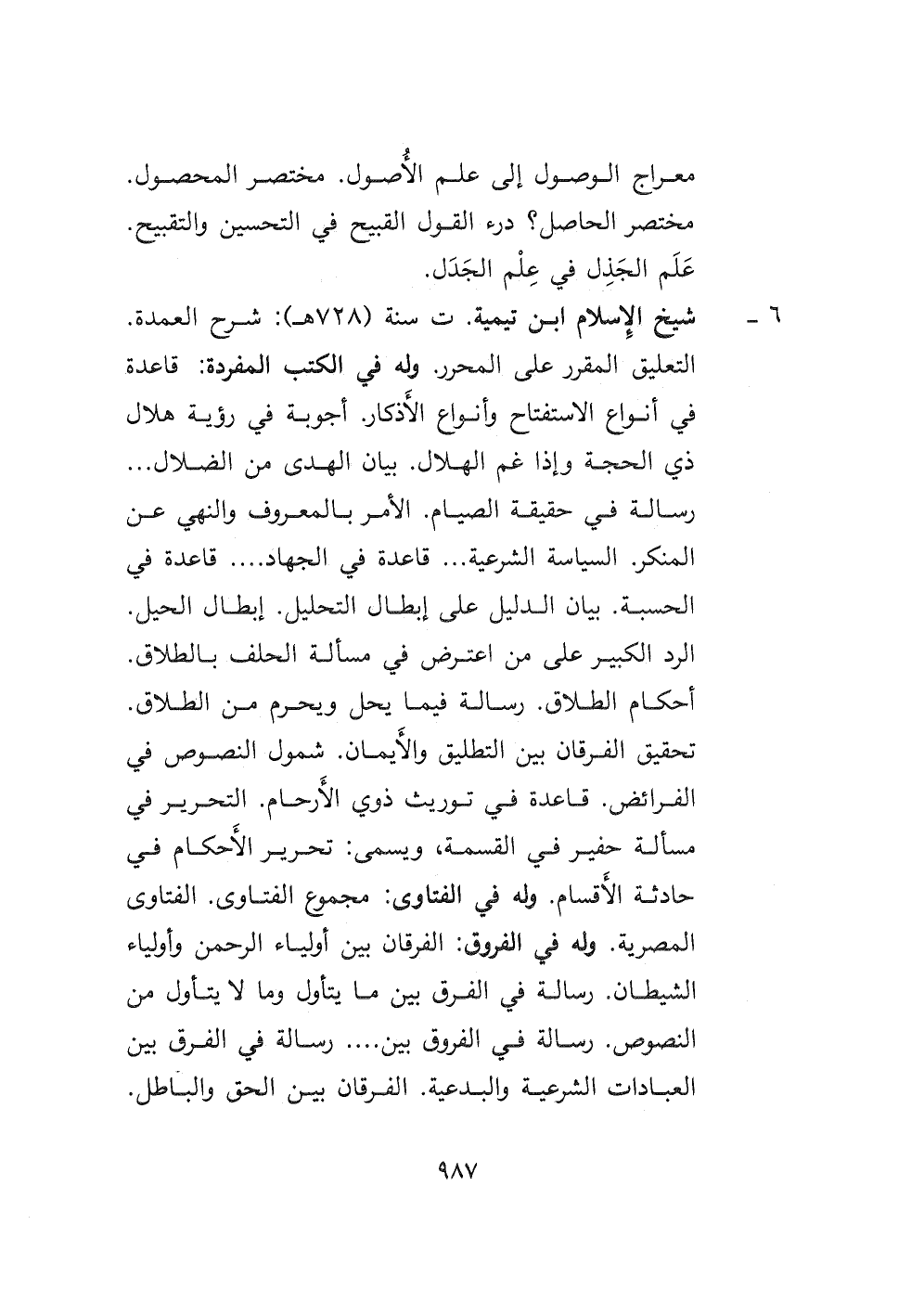 ٦- شيخ الإسلام ابن تيمية ت سنة (٧٢٨ هـ) : شرح العمدة. التعليق المقرر على المحرر وله في الكتب المفردة: قاعدة في أنواع الاستفتاح وأنواع الأذكار أجوبة في رؤية هلال ذي الحجة وإذا غم الهلال. بيان الهدى من الضلال ... رسالة في حقيقة الصيام. الأمر بالمعروف والنهي عن المنكر. السياسة الشرعية ... قاعدة في الجهاد ... قاعدة في الحسبة. بيان الدليل على إبطال التحليل. إبطال الحيل. الرد الكبير على من اعترض في مسألة الحلف بالطلاق. أحكام الطلاق. رسالة فيما يحل ويحرم من الطلاق. تحقيق الفرقان بين التطليق والأيمان. شمول النصوص في الفرائض. قاعدة في توريث ذوي الأرحام. التحرير في مسألة حفير في القسمة، ويسمى: تحرير الأحكام في حادثة الأقسام. وله في الفتاوى: مجموع الفتاوى. الفتاوى المصرية. وله في الفروق: الفرقان بين أولياء الرحمن وأولياء الشيطان. رسالة في الفرق بين ما يتأول وما لا يتأول من النصوص. رسالة في الفروق بين ... رسالة في الفرق بين العبادات الشرعية والبدعية. الفرقان بين الحق والباطل.