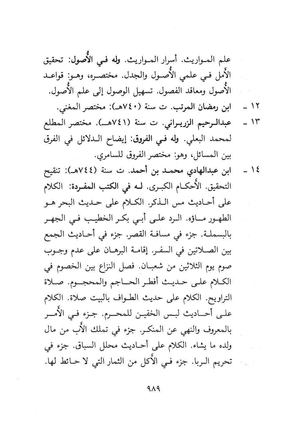 ١٤- ابن عبد الهادي محمد بن أحمد ت سنة (٧٤٤ هـ) : تنقيح التحقيق. الأحكام الكبرى. له في الكتب المفردة: الكلام على أحاديث مس الذكر. الكلام على حديث البحر هو الطهور ماؤه. الرد على أبي بكر الخطيب في الجهر بالبسملة. جزء في مسافة القصر جزء في أحاديث الجمع بين الصلاتين في السفر إقامة البرهان على عدم وجوب صوم يوم الثلاثين من شعبان. فصل النزاع بين الخصوم في الكلام على حديث أفطر الحاجم والمحجوم. صلاة التراويح. الكلام على حديث الطواف بالبيت صلاة. الكلام على أحاديث لبس الخفين للمحرم. جزء في الأمر بالمعروف والنهي عن المنكر. جزء في تملك الأب من مال ولده ما يشاء. الكلام على أحاديث محلل السباق. جزء في تحريم الربا. جزء في الأكل من الثمار التي لا حائط لها.