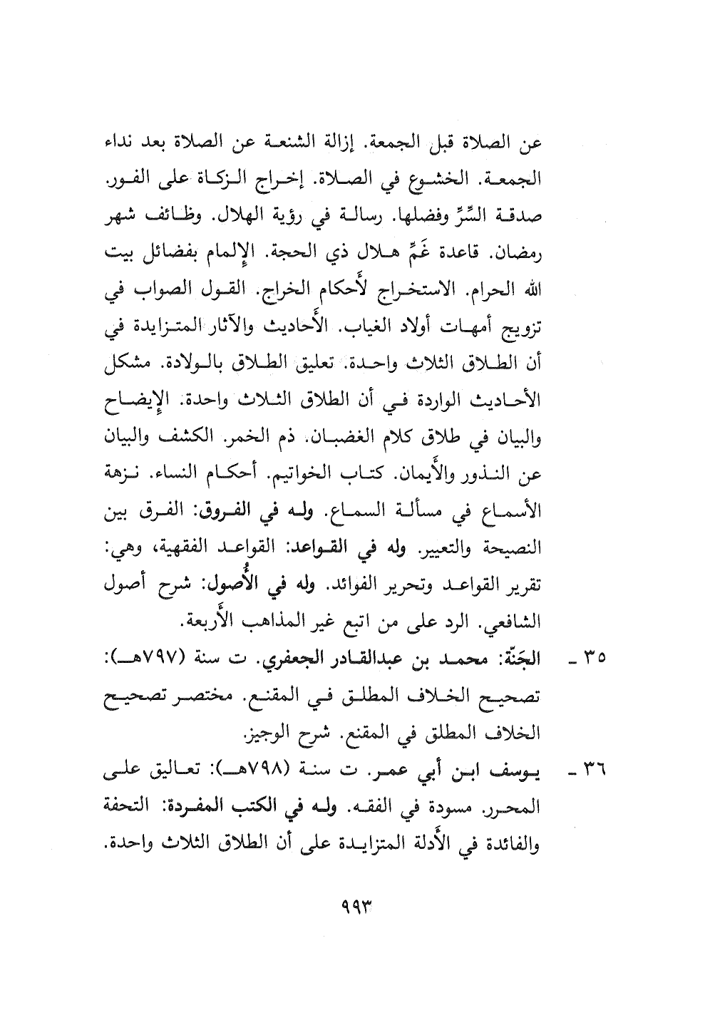 ٣٦- يوسف ابن أبي عمر ت سنة (٧٩٨ هـ) : تعاليق على المحرر مسودة في الفقه. وله في الكتب المفردة: التحفة والفائدة في الأدلة المتزايدة على أن الطلاق الثلاث واحدة.