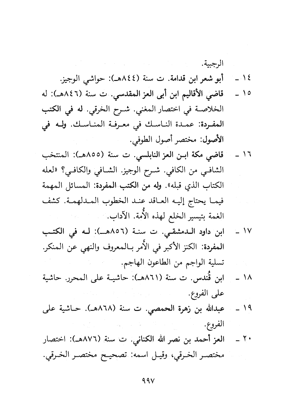 ١٥- قاضي الأقاليم ابن أبى العز المقدسي ت سنة (٨٤٦ هـ) : له الخلاصة في اختصار المغني. شرح الخرقي. له في الكتب المفردة: عمدة الناسك في معرفة المناسك. وله في الأصول: مختصر أصول الطوفي.
