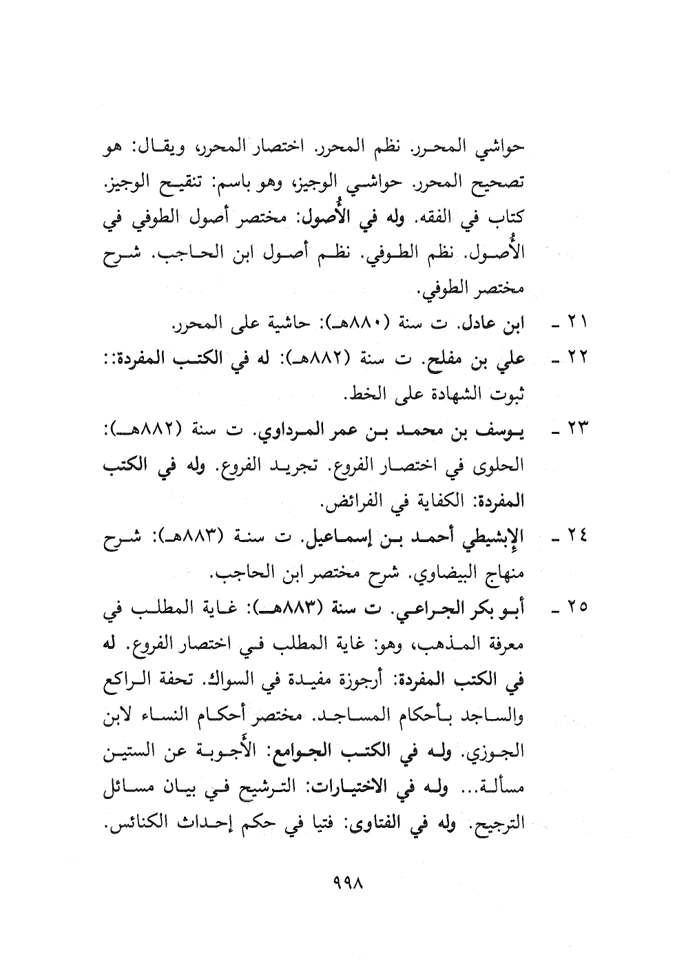 ٢٣- يوسف بن محمد بن عمر المرداوي ت سنة (٨٨٢ هـ) : الحلوى في اختصار الفروع. تجريد الفروع. وله في الكتب المفردة: الكفاية في الفرائض.