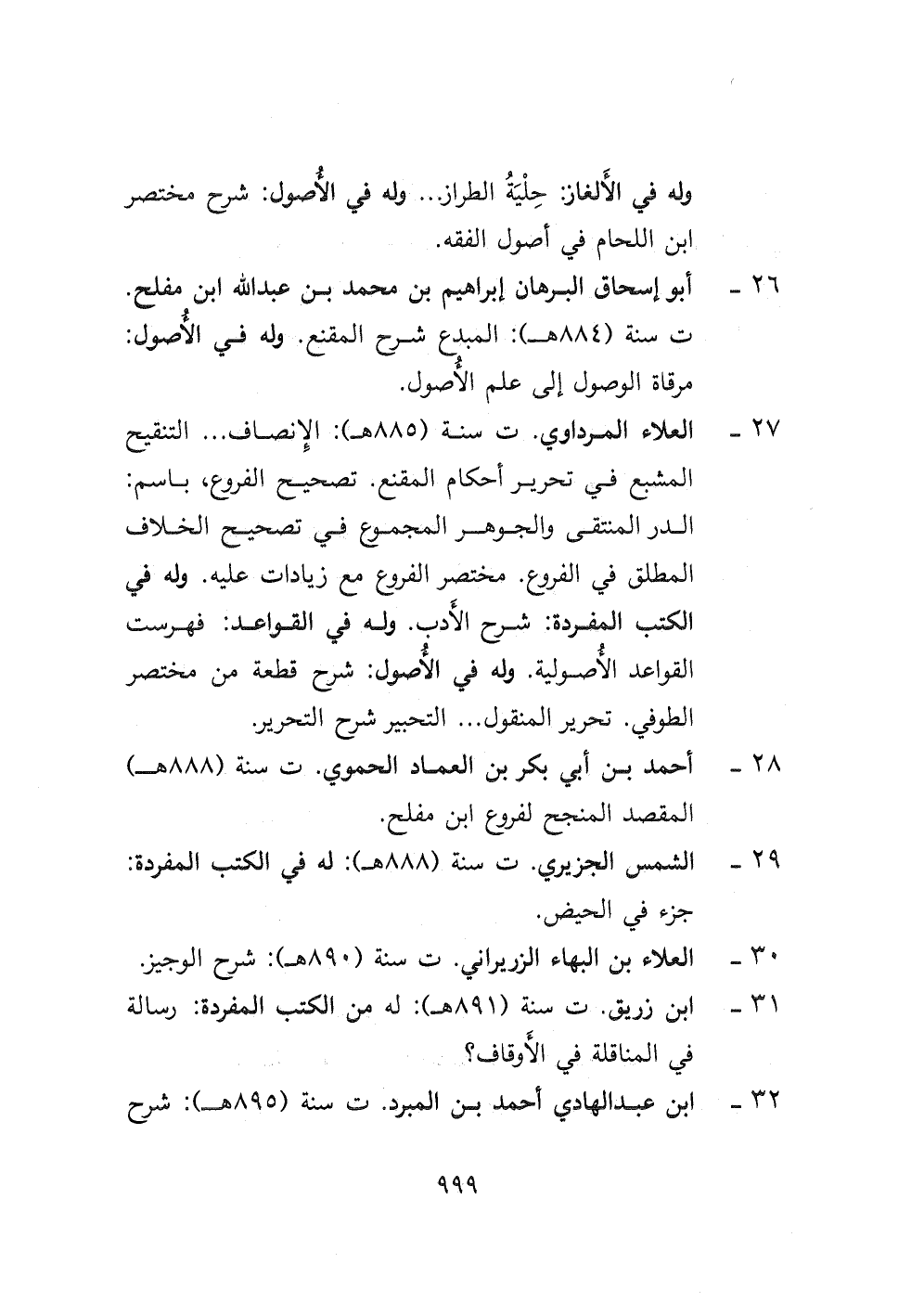 ٢٧- العلاء المرداوي ت سنة (٨٨٥ هـ) : الإنصاف ... التنقيح المشبع في تحرير أحكام المقنع. تصحيح الفروع، باسم: الدر المنتقى والجوهر المجموع في تصحيح الخلاف المطلق في الفروع. مختصر الفروع مع زيادات عليه. وله في الكتب المفردة: شرح الأدب. وله في القواعد: فهرست القواعد الأصولية. وله في الأصول: شرح قطعة من مختصر الطوفي. تحرير المنقول ... التحبير شرح التحرير.