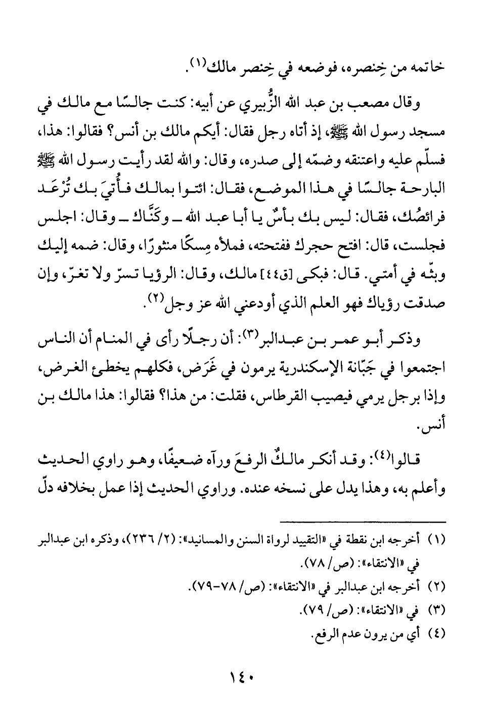 وقال مصعب بن عبد الله الزُّبيري عن أبيه: كنت جالسًا مع مالك في