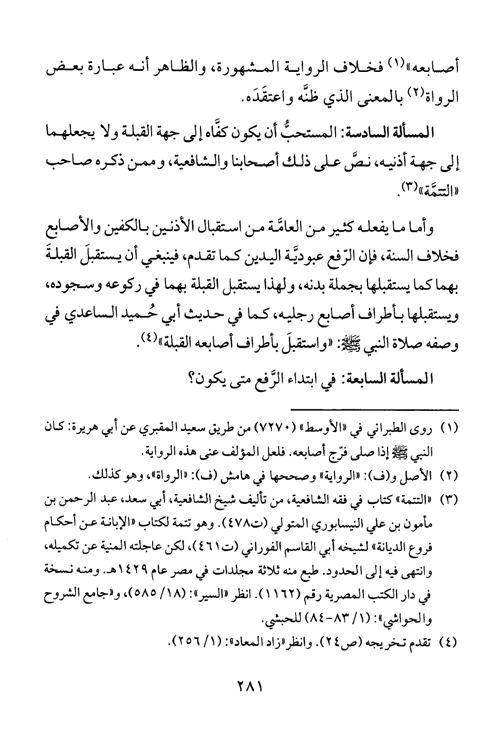 وصفه صلاة النبي صَلَّى اللهُ عَلَيْهِ وَسَلَّمَ: «واستقبلَ بأطراف أصابعه القبلة» (4).