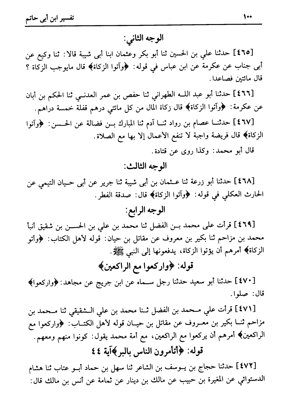 469 - قَرَأْتُ عَلَى مُحَمَّدِ بْنِ الْفَضْلِ ثنا مُحَمَّدُ بْنُ عَلِيِّ بْنِ الْحَسَنِ بْنِ شَقِيقٍ أَنْبَأَ مُحَمَّدُ بْنُ مُزَاحِمٍ ثنا بُكَيْرُ بْنُ مَعْرُوفٍ عَنْ مُقَاتِلِ بْنِ حَيَّانَ: قَوْلُهُ لأَهْلِ الْكِتَابِ: وَآتُوا الزَّكَاةَ أَمَرَهُمْ أَنْ يُؤْتُوا الزَّكَاةَ، يَدْفَعُونَهَا إِلَى النَّبِيِّ صَلَّى اللَّهُ عَلَيْهِ وَسَلَّمَ.