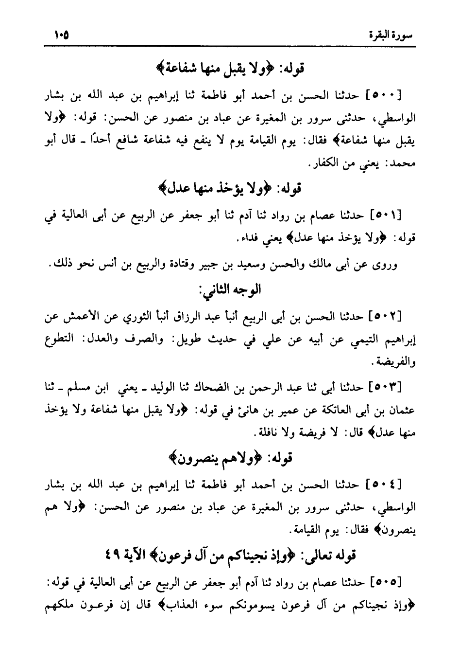 504 - حَدَّثَنَا الْحَسَنُ بْنُ أَحْمَدَ أَبُو فَاطِمَةَ ثنا إِبْرَاهِيمُ بْنُ عَبْدِ اللَّهِ بْنِ بَشَّارٍ الْوَاسِطِيُّ، حَدَّثَنِي سُرُورُ بْنُ الْمُغِيرَةِ عَنْ عَبَّادِ بْنِ مَنْصُورٍ عَنِ الْحَسَنِ: وَلا هُمْ يُنْصَرُونَ فَقَالَ: يَوْمَ الْقِيَامَةِ.