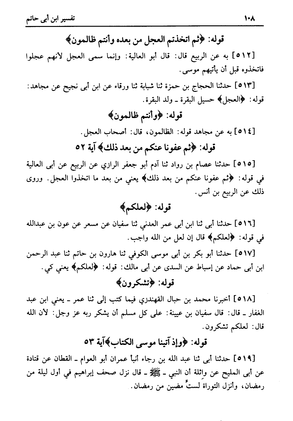 515 - حَدَّثَنَا عِصَامُ بْنُ رَوَّادٍ ثنا آدَمُ أَبُو جَعْفَرٍ الرَّازِيُّ عَنِ الرَّبِيعِ عَنْ أَبِي الْعَالِيَةِ فِي قَوْلِهِ: ثُمَّ عَفَوْنَا عَنْكُمْ مِنْ بَعْدِ ذَلِكَ يَعْنِي مِنْ بَعْدِ مَا اتَّخَذُوا الْعِجْلَ. وَرُوِيَ ذَلِكَ عَنِ الرَّبِيعِ بْنِ أَنَسٍ.