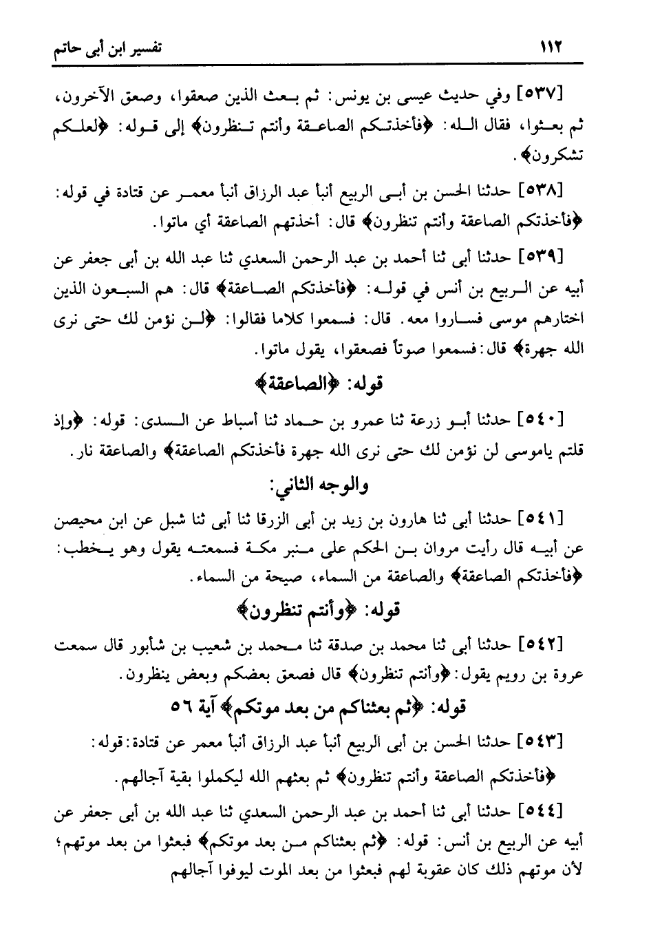 539 - حَدَّثَنَا أَبِي ثنا أَحْمَدُ بْنُ عَبْدِ الرَّحْمَنِ السَّعْدِيُّ ثنا عَبْدُ اللَّهِ بْنُ أَبِي جَعْفَرٍ عَنْ أَبِيهِ عَنِ الرَّبِيعِ بْنِ أَنَسٍ فِي قَوْلِهِ: فَأَخَذَتْكُمُ الصَّاعِقَةُ قَالَ: هُمُ السَّبْعُونَ الَّذِينَ اخْتَارَهُمْ مُوسَى فَسَارُوا مَعَهُ. قَالَ: فَسَمِعُوا كَلامًا فَقَالُوا: لَنْ نُؤْمِنَ لَكَ حَتَّى نَرَى اللَّهَ جَهْرَةً قَالَ: فَسَمِعُوا صَوْتًا فَصَعِقُوا، يَقُولُ مَاتُوا.