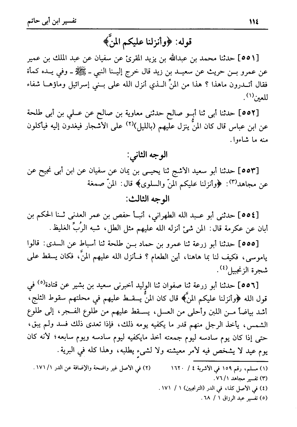 553 - حَدَّثَنَا أَبُو سَعِيدٍ الأَشَجُّ ثنا يَحْيَى بْنُ يَمَانٍ عَنْ سُفْيَانَ عَنِ ابْنِ أَبِي نَجِيحٍ عَنْ عَنِ مُجَاهِدٍ «3» وَأَنْزَلْنَا عَلَيْكُمُ الْمَنَّ وَالسَّلْوَى قَالَ: الْمَنُّ صَمْغَةٌ