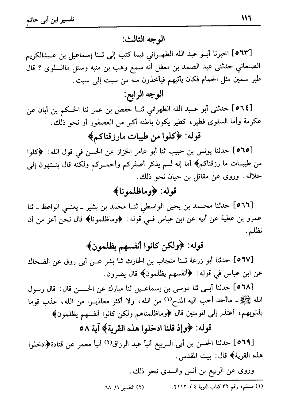 564 - حَدَّثَنِي أَبُو عَبْدِ اللَّهِ الطِّهْرَانِيُّ ثنا حَفْصُ بْنُ عُمَرَ ثنا الْحَكَمُ بْنُ أَبَانَ عَنْ عِكْرِمَةَ وَأَمَّا السَّلْوَى فَطَيْرٌ، كَطَيْرٍ يَكُونُ بَاطِنُهُ أَكْبَرَ مِنَ الْعُصْفُورِ أَوْ نَحْوَ ذَلِكَ.