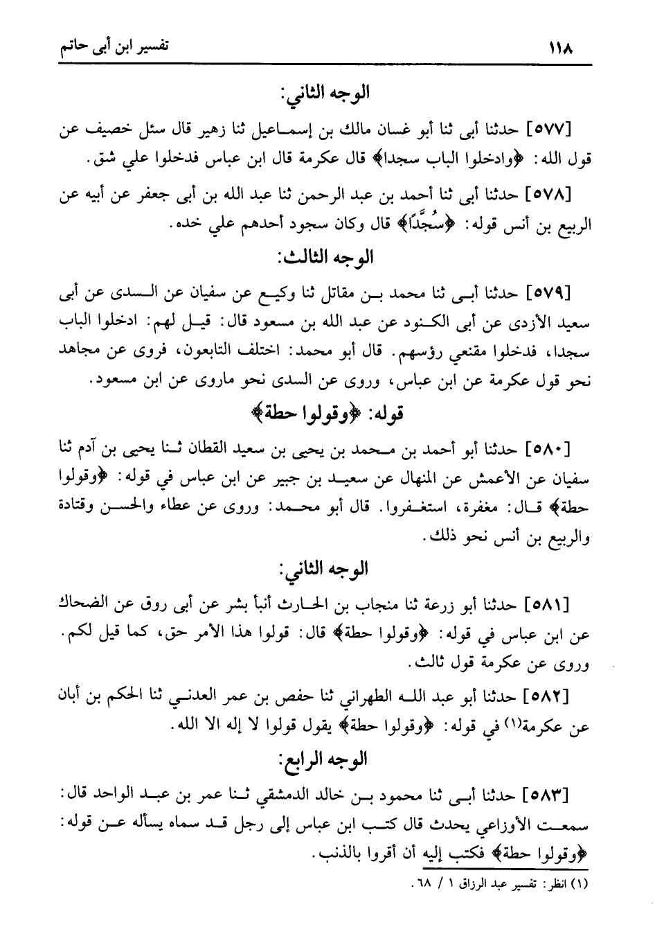 582 - حَدَّثَنَا أَبُو عَبْدِ اللَّهِ الطِّهْرَانِيُّ ثنا حَفْصُ بْنُ عُمَرَ الْعَدَنِيُّ ثنا الْحَكَمُ بْنُ أَبَانَ عَنْ عِكْرِمَةَ «1» فِي قَوْلِهِ: وَقُولُوا حِطَّةٌ يَقُولُ قُولُوا لَا إِلَهَ إِلَّا اللَّهُ.