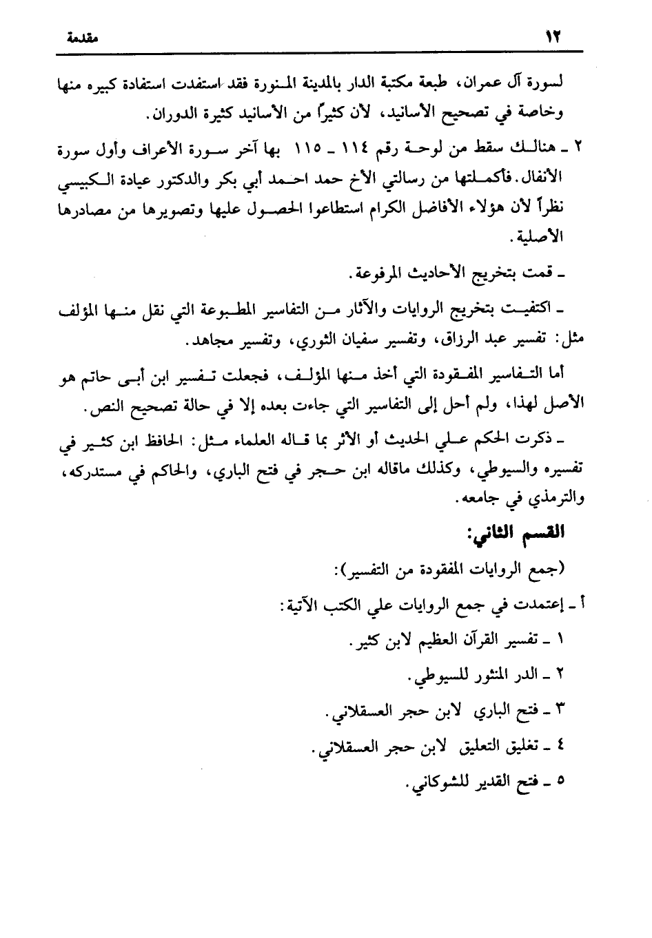 لسورة آل عمران، طبعة مكتبة الدار بالمدينة المنورة فقد استفدت استفادة كبيره منها وخاصة في تصحيح الأسانيد، لأن كثيرا من الأسانيد كثيرة الدوران.