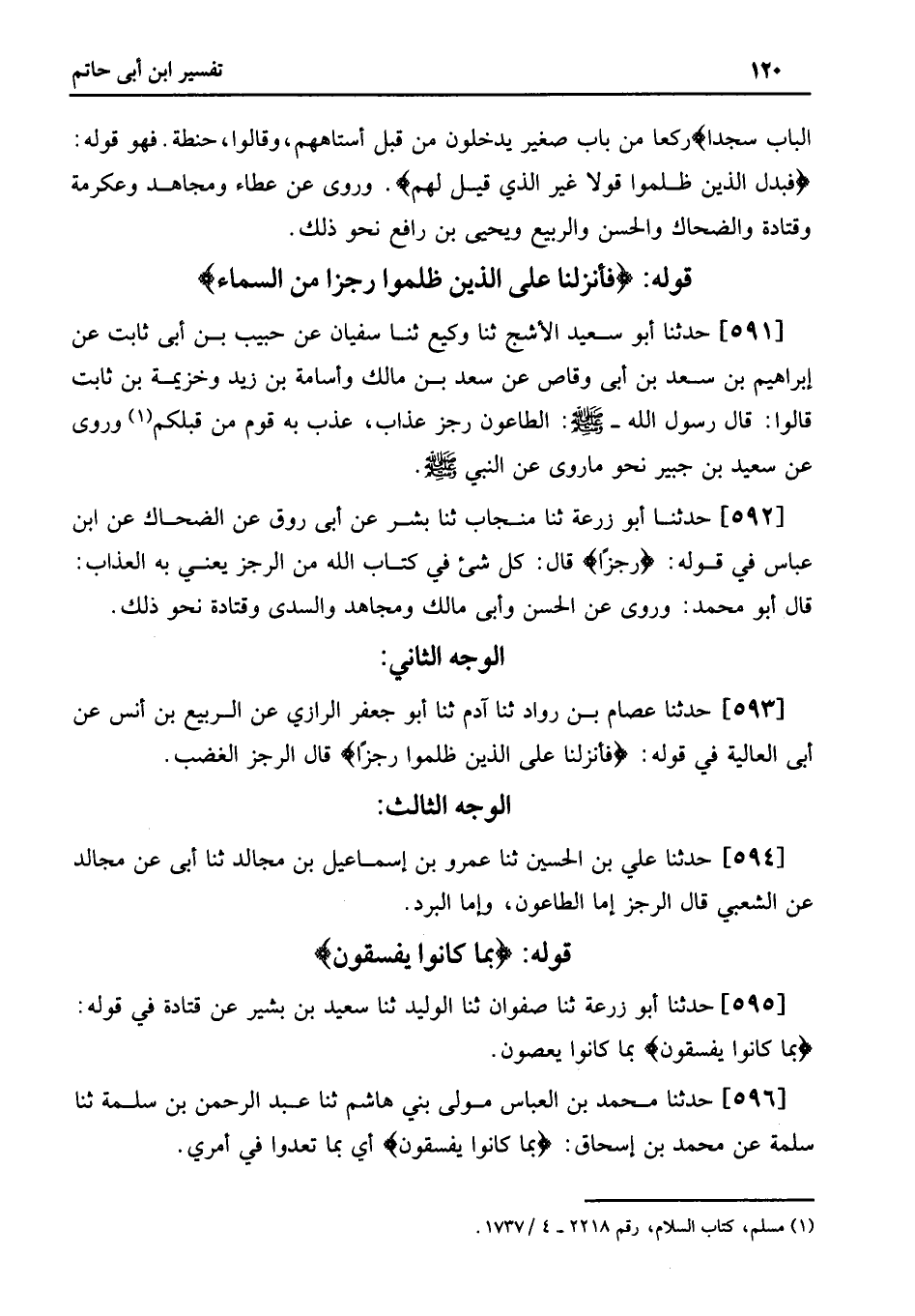 592 - حَدَّثَنَا أَبُو زُرْعَةَ ثنا مِنْجَابٌ ثنا بِشْرٌ عَنْ أَبِي رَوْقٍ عَنِ الضَّحَّاكِ عَنِ ابْنِ عَبَّاسٍ فِي قَوْلِهِ: رِجْزًا قَالَ: كُلُّ شَيْءٍ فِي كِتَابِ اللَّهِ مِنَ الرِّجْزِ يَعْنِي بِهِ الْعَذَابَ: