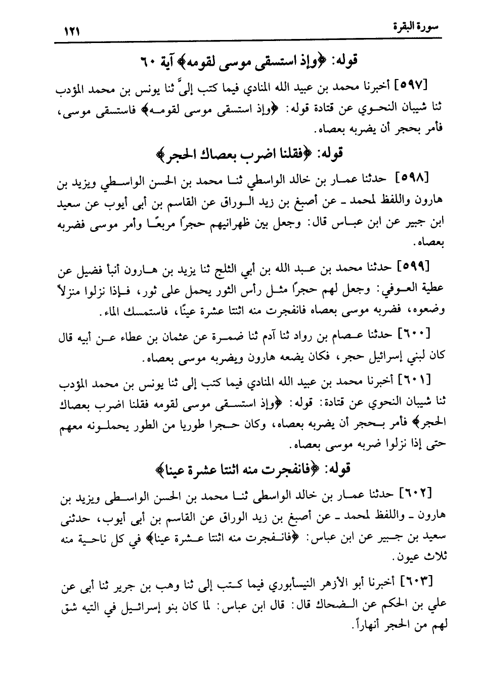601 - أَخْبَرَنَا مُحَمَّدُ بْنُ عُبَيْدِ اللَّهِ الْمُنَادِي فِيمَا كَتَبَ إِلَيَّ ثنا يُونُسُ بْنُ مُحَمَّدٍ الْمُؤَدِّبُ ثنا شَيْبَانُ النَّحْوِيُّ عَنْ قَتَادَةَ: قَوْلُهُ: وَإِذِ اسْتَسْقَى مُوسَى لِقَوْمِهِ فَقُلْنَا اضْرِبْ بِعَصَاكَ الْحَجَرَ فَأُمِرَ بِحَجَرٍ أَنْ يَضْرِبَهُ بِعَصَاهُ، وَكَانَ حَجَرًا طُورِيًّا مِنَ الطُّورِ يَحْمِلُونَهُ مَعَهُمْ حَتَّى إِذَا نَزَلُوا ضَرَبَهُ مُوسَى بِعَصَاهُ.