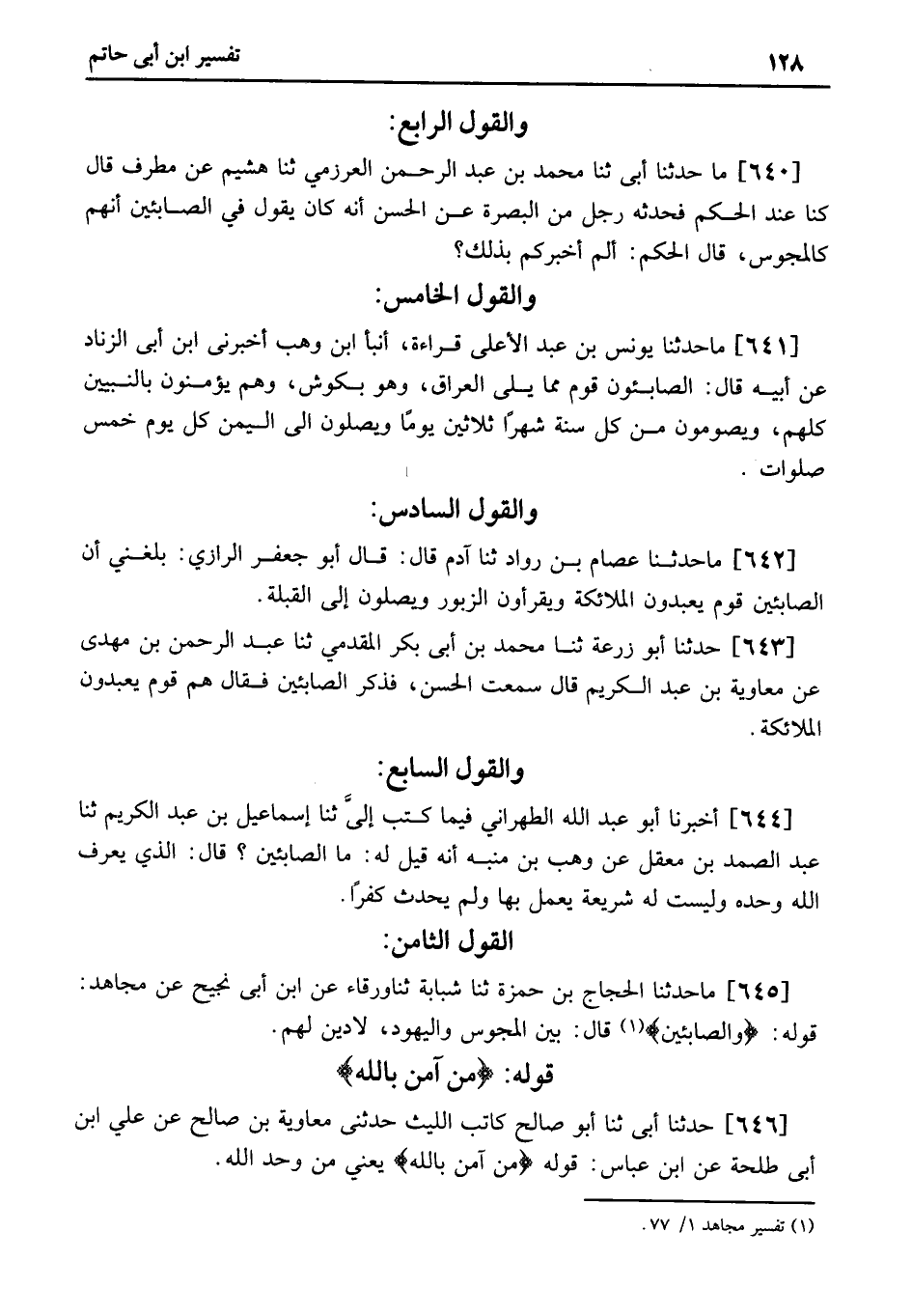 642 - مَا حَدَّثَنَا عِصَامُ بْنُ رَوَّادٍ ثنا آدَمُ قَالَ: قَالَ أَبُو جَعْفَرٍ الرَّازِيُّ: بَلَغَنِي أَنَّ الصَّابِئِينَ قوم يَعْبُدُونَ الْمَلائِكَةَ وَيَقْرَءُونَ الزَّبُورَ وَيُصَلُّونَ إِلَى الْقِبْلَةِ.