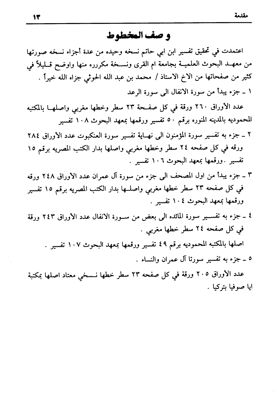 اعتمدت في تحقيق تفسير ابن ابي حاتم نسخه وحيده من عدة أجزاء نسخه صورتها من معهد البحوث العلمية بجامعة أم القرى ونسخة مكررة منها وأوضح قليلا في كثير من صفحاتها من الأخ الأستاذ/ محمد بن عبد الله الحوثي جزاه الله خيرا.