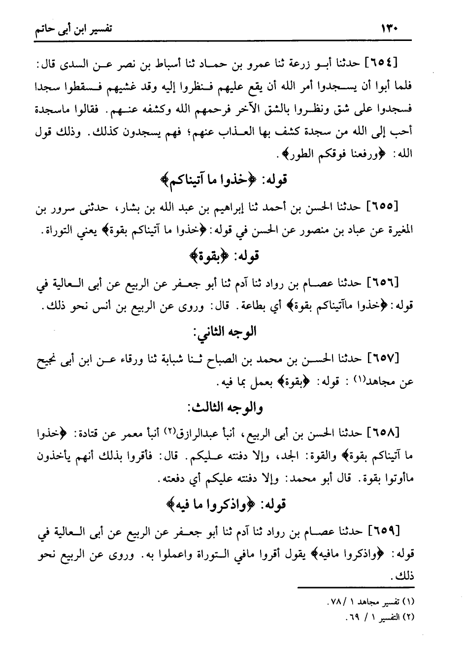 656 - حَدَّثَنَا عِصَامُ بْنُ رَوَّادٍ ثنا آدَمُ ثنا أَبُو جَعْفَرٍ عَنِ الرَّبِيعِ عَنْ أَبِي الْعَالِيَةِ فِي قَوْلِهِ: خُذُوا مَا آتَيْنَاكُمْ بِقُوَّةٍ أَيْ بِطَاعَةٍ. قَالَ: وَرُوِيَ عَنِ الرَّبِيعِ بْنِ أَنَسٍ نَحْوُ ذَلِكَ.