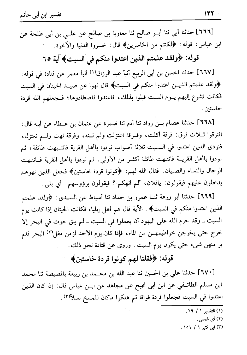 669 - حَدَّثَنَا أَبُو زُرْعَةَ ثنا عَمْرُو بْنُ حَمَّادٍ ثنا أَسْبَاطٌ عَنِ السُّدِّيِّ: وَلَقَدْ عَلِمْتُمُ الَّذِينَ اعتدوا منكم في السبت. الآية قَالَ هُمْ أَهْلُ أَيْلَياء فَكَانَتِ الْحِيتَانُ إِذَا كَانَتْ يَوْمَ السَّبْتِ- وَقَدْ حَرَّمَ اللَّهُ عَلَى الْيَهُودِ أَنْ يَعْمَلُوا فِي السَّبْتِ- لَمْ يَبْقَ حُوتٌ فِي الْبَحْرِ إِلا خَرَجَ حَتَّى يُخْرِجْنَ خَرَاطِيمَهُنَّ مِنَ الْمَاءِ، فَإِذَا كَانَ يَوْمُ الأَحَدِ لَزِمْنَ مُقِلَّ «2» الْبَحْرِ فَلَمْ يُرْ مِنْهُنَّ شَيْءٌ حَتَّى يَكُونَ يَوْمُ السَّبْتِ. وَرُوِيَ عَنْ قَتَادَةَ نَحْوُ ذَلِكَ.