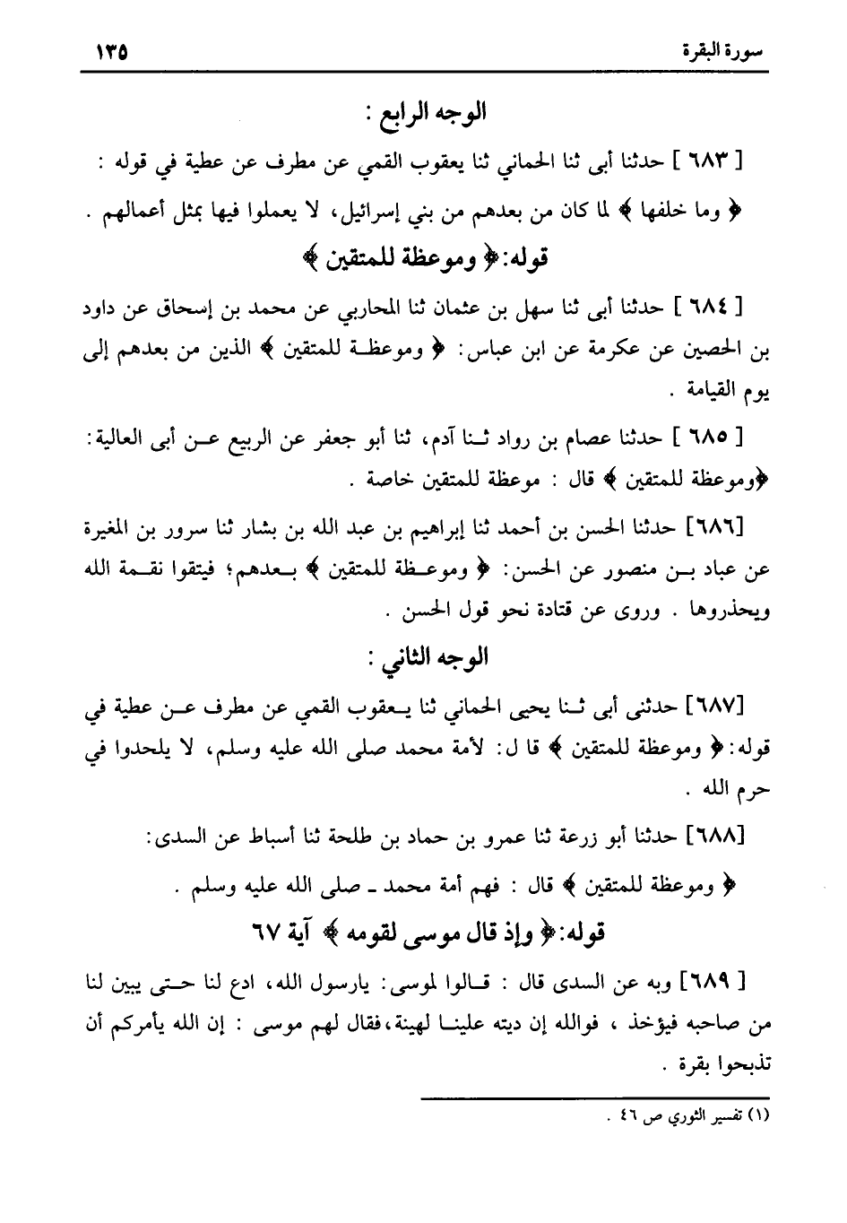 686 - حَدَّثَنَا الْحَسَنُ بْنُ أَحْمَدَ ثنا إِبْرَاهِيمُ بْنُ عَبْدِ اللَّهِ بْنِ بَشَّارٍ ثنا سُرُورُ بْنُ الْمُغِيرَةِ عَنْ عَبَّادِ بْنِ مَنْصُورٍ عَنِ الْحَسَنِ: وَمَوْعِظَةً لِلْمُتَّقِينَ بَعْدَهُمْ فَيَتَّقُوا نِقْمَةَ اللَّهِ وَيْحَذَرُوهَا. وَرُوِيَ عَنْ قَتَادَةَ نَحْوُ قَوْلِ الْحَسَنِ.