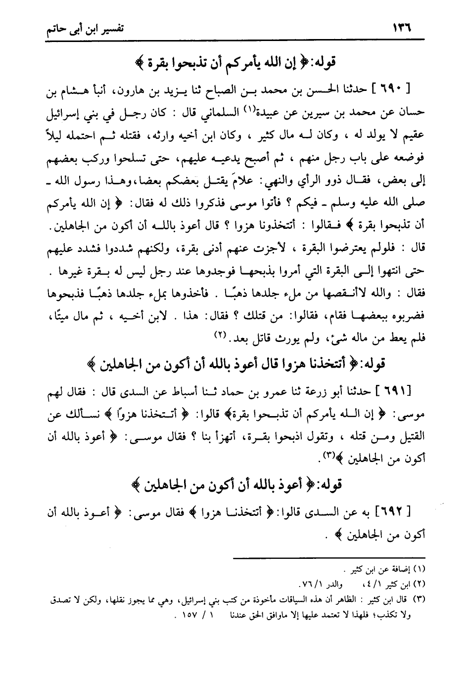 691 - حَدَّثَنَا أَبُو زُرْعَةَ ثنا عَمْرُو بْنُ حَمَّادٍ ثنا أَسْبَاطٌ عَنِ السُّدِّيِّ قَالَ: فَقَالَ لَهُمْ مُوسَى: إِنَّ اللَّهَ يَأْمُرُكُمْ أَنْ تَذْبَحُوا بَقَرَةً قَالُوا: أَتَتَّخِذُنَا هُزُوًا نَسْأَلُكَ عَنِ الْقَتِيلِ وَمَنْ قَتَلَهُ، وَتَقُولُ اذْبَحُوا بَقَرَةً، أَتَهْزَأُ بِنَا؟ فَقَالَ مُوسَى: أَعُوذُ بِاللَّهِ أَنْ أَكُونَ مِنَ الْجَاهِلِينَ «3» .