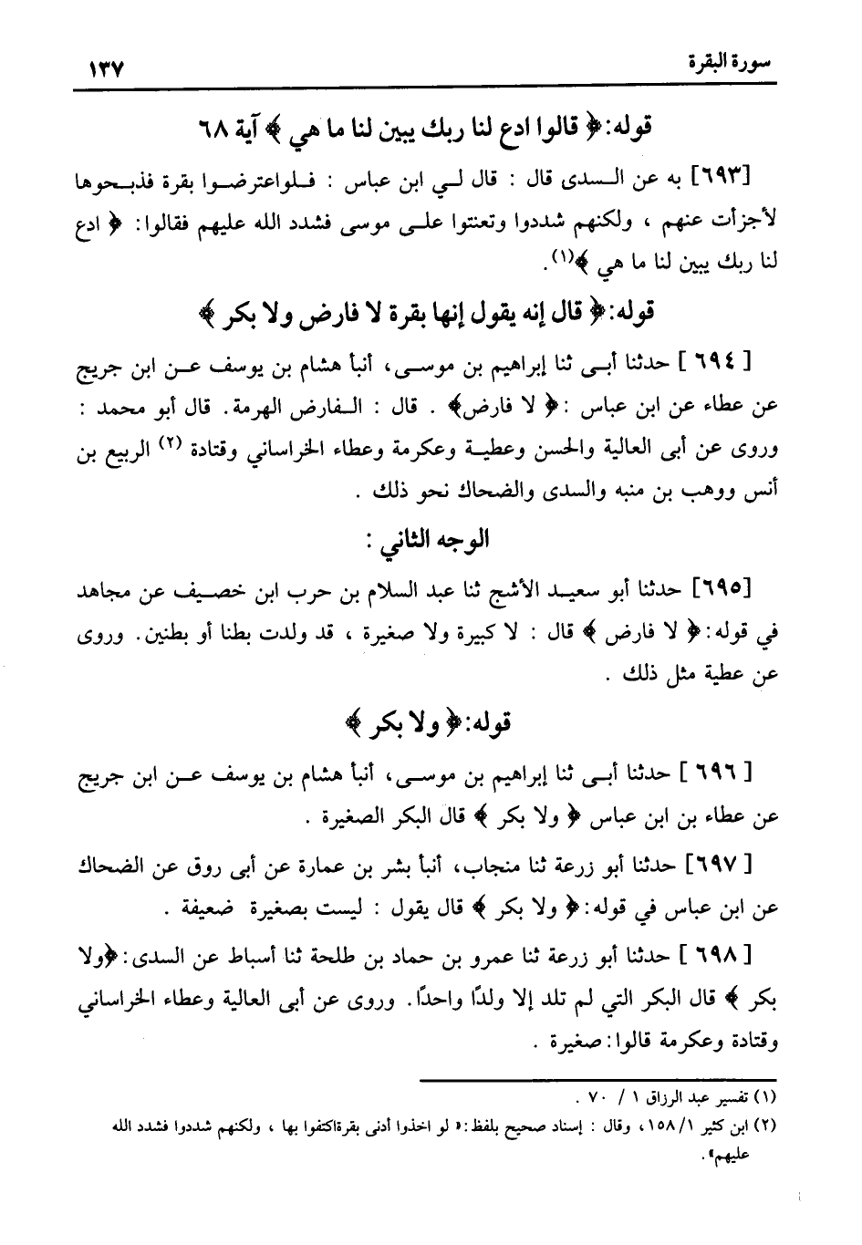 695 - حَدَّثَنَا أَبُو سَعِيدٍ الأَشَجُّ ثنا عَبْدُ السَّلَامِ بن حرب ابن خُصَيْفٌ عَنْ مُجَاهِدٍ فِي قَوْلِهِ: لَا فَارْضٌ قَالَ: لَا كَبِيرَةٌ وَلا صَغِيرَةٌ، قَدْ وَلَدَتْ بَطْنًا أَوْ بَطْنَيْنِ. وَرُوِيَ عَنْ عَطِيَّةَ مِثْلُ ذَلِكَ.