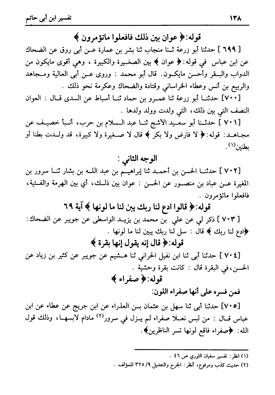 699 - حَدَّثَنَا أَبُو زُرْعَةَ ثنا مِنْجَابٌ ثنا بِشْرٌ بْنُ عُمَارَةَ عَنْ أَبِي رَوْقٍ عَنِ الضَّحَّاكِ عَنِ ابْنِ عَبَّاسٍ فِي قَوْلِهِ: عَوَانٌ بَيْنَ الصَّغِيرَةِ وَالْكَبِيرَةِ، وَهِيَ أَقْوَى مَا يَكُونُ مِنَ الدَّوَابِّ وَالْبَقَرِ وَأَحْسَنُ مَا يَكُونُ. قَالَ أَبُو مُحَمَّدٍ: وَرُوِيَ عَنْ أَبَى الْعَالِيَةِ وَمُجَاهِدٍ وَالرَّبِيعِ بْنِ أَنَسٍ وَعَطَاءٍ الْخُرَاسَانِيِّ وَقَتَادَةَ وَالضَّحَّاكِ وَعِكْرِمَةَ نَحْوُ ذَلِكَ.