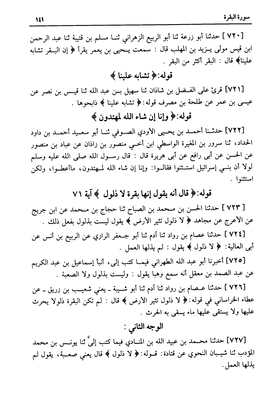 720 - حَدَّثَنَا أَبُو زُرْعَةَ ثنا أَبُو الرَّبِيعِ الزَّهْرَانِيُّ ثنا مُسْلِمُ بْنُ قُتَيْبَةَ ثنا عَبْدُ الرَّحْمَنِ ابن قَيْسٍ مَوْلَى يَزِيدَ بْنِ الْمُهَلَّبِ قَالَ: سَمِعْتُ يَحْيَى بْنَ يَعْمُرَ يَقْرَأُ إِنَّ الْبَقِرَ تَشَابَهَ علينا قال: البقر أَكْثَرُ مِنَ الْبَقَرِ.