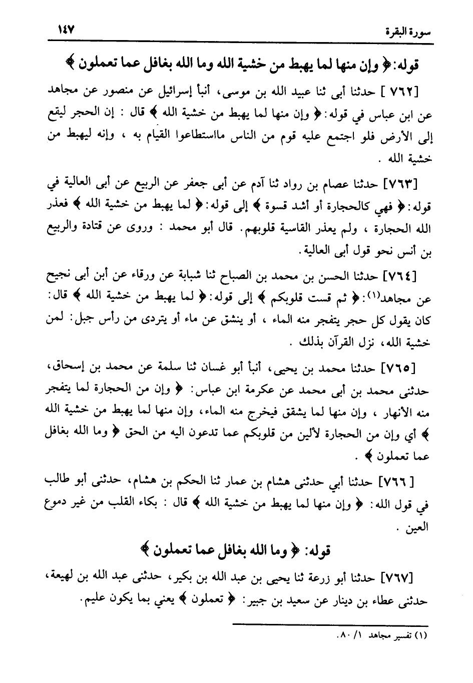 764 - حَدَّثَنَا الْحَسَنُ بْنُ مُحَمَّدِ بْنِ الصَّبَّاحِ ثنا شَبَابَةُ عَنْ وَرْقَاءَ عَنِ ابْنِ أَبِي نَجِيحٍ عَنْ مُجَاهِدٍ «1» : ثُمَّ قَسَتْ قُلُوبُكُمْ إِلَى قَوْلِهِ: لَمَا يَهْبِطُ مِنْ خَشْيَةِ اللَّهِ قَالَ: