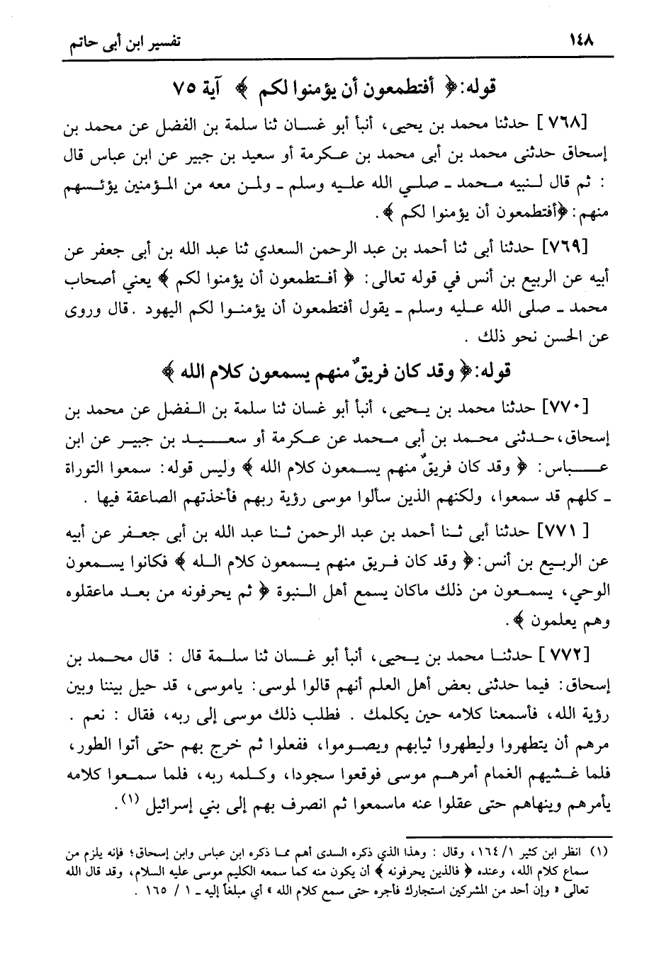 770 - حَدَّثَنَا مُحَمَّدُ بْنُ يَحْيَى، أَنْبَأَ أَبُو غَسَّانَ ثنا سَلَمَةُ بْنُ الْفَضْلِ عَنْ مُحَمَّدِ بْنِ إِسْحَاقَ، حَدَّثَنِي مُحَمَّدُ بْنُ أَبِي مُحَمَّدٍ عَنْ عِكْرِمَةَ أَوْ سَعِيدِ بْنِ جُبَيْرٍ عَنِ ابْنِ عَبَّاسٍ: وَقَدْ كَانَ فَرِيقٌ مِنْهُمْ يَسْمَعُونَ كَلامَ اللَّهِ وَلَيْسَ قَوْلُهُ: سَمِعُوا التَّوْرَاةَ- كُلُّهُمْ قَدْ سَمِعُوا، وَلَكِنَّهُمُ الَّذِينَ سَأَلُوا مُوسَى رُؤْيَةَ رَبِّهِمْ فَأَخَذَتْهُمُ الصَّاعِقَةُ فِيهَا.