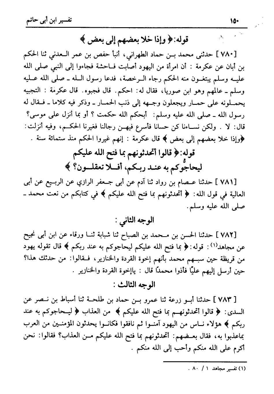 783 - حَدَّثَنَا أَبُو زُرْعَةَ ثنا عَمْرُو بْنُ حَمَّادِ بْنِ طَلْحَةَ ثنا أَسْبَاطُ بْنُ نَصْرٍ عَنِ السُّدِّيِّ: قَالُوا أَتُحَدِّثُونَهُمْ بِمَا فَتَحَ اللَّهُ عَلَيْكُمْ مِنَ الْعَذَابِ لِيُحَاجُّوكُمْ بِهِ عِنْدَ رَبِّكُمْ هَؤُلاءِ نَاسٌ مِنَ الْيَهُودِ آمَنُوا ثُمَّ نَافَقُوا فَكَانُوا يُحَدِّثُونَ الْمُؤْمِنِينَ مِنَ الْعَرَبِ بِمَا عُذِّبُوا بِهِ، فَقَالَ بَعْضُهُمْ: أَتُحَدِّثُونَهُمْ بِمَا فَتَحَ اللَّهُ عَلَيْكُمْ مِنَ الْعَذَابِ؟ فَقَالُوا: نَحْنُ أَكْرَمُ عَلَى اللَّهِ مِنْكُمْ وَأَحَبُّ إلى الله منكم.