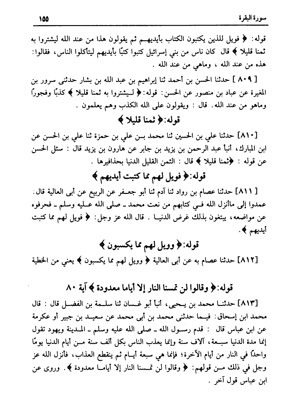 قَوْلِهِ: فَوَيْلٌ لِلَّذِينَ يَكْتُبُونَ الْكِتَابَ بِأَيْدِيهِمْ ثُمَّ يَقُولُونَ هَذَا مِنْ عِنْدِ اللَّهِ لِيَشْتَرُوا بِهِ ثَمَنًا قَلِيلا قَالَ كَانَ نَاسٌ مِنْ بَنِي إِسْرَائِيلَ كَتَبُوا كُتُبًا بِأَيْدِيهِمْ لِيَتَأَكَّلُوا النَّاسَ، فَقَالُوا:
