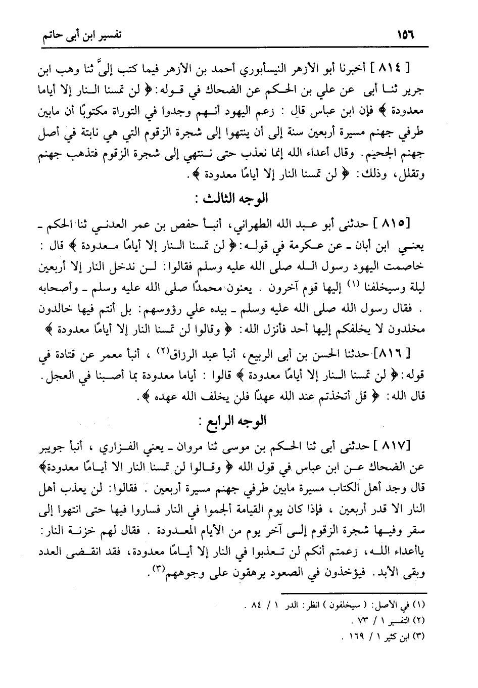 817 - حَدَّثَنِي أَبِي ثنا الْحَكَمُ بْنُ مُوسَى ثنا مَرْوَانُ- يَعْنِي الْفَزَارِيَّ، أَنْبَأَ جُوَيْبِرٌ عَنِ الضَّحَّاكِ عَنِ ابْنِ عَبَّاسٍ فِي قَوْلِ اللَّهِ وقالوا لن تمسنا النار إلا أياما معدودة قَالَ وَجَدَ أَهْلُ الْكِتَابِ مَسِيرَةَ مَا بَيْنَ طَرَفَيْ جَهَنَّمَ مَسِيرَةَ أَرْبَعِينَ. فَقَالُوا: لَنْ يُعَذَّبَ أَهْلُ النَّارِ إِلا قَدْرَ أَرْبَعِينَ، فَإِذَا كَانَ يَوْمُ الْقِيَامَةِ أُلْجِمُوا فِي النَّارِ فَسَارُوا فِيهَا حَتَّى انْتَهَوْا إِلَى سَقَرَ وَفِيهَا شَجَرَةُ الزَّقُّومِ إِلَى آخِرِ يَوْمٍ مِنَ الأَيَّامِ الْمَعْدُودَةِ. فَقَالَ لَهُمْ خَزَنَةُ النَّارِ: