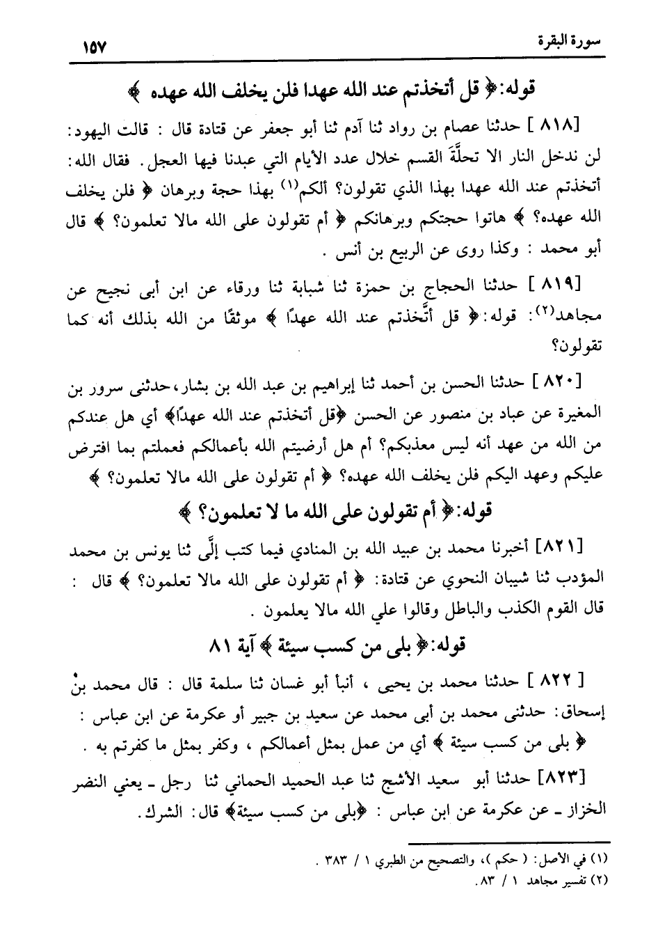 821 - أَخْبَرَنَا مُحَمَّدُ بْنُ عُبَيْدِ اللَّهِ بْنِ الْمُنَادِي فِيمَا كَتَبَ إِلَيَّ ثنا يُونُسُ بْنُ مُحَمَّدٍ الْمُؤَدِّبُ ثنا شَيْبَانُ النَّحْوِيُّ عَنْ قَتَادَةَ: أَمْ تَقُولُونَ عَلَى اللَّهِ مَا لا تَعْلَمُونَ؟ قَالَ: