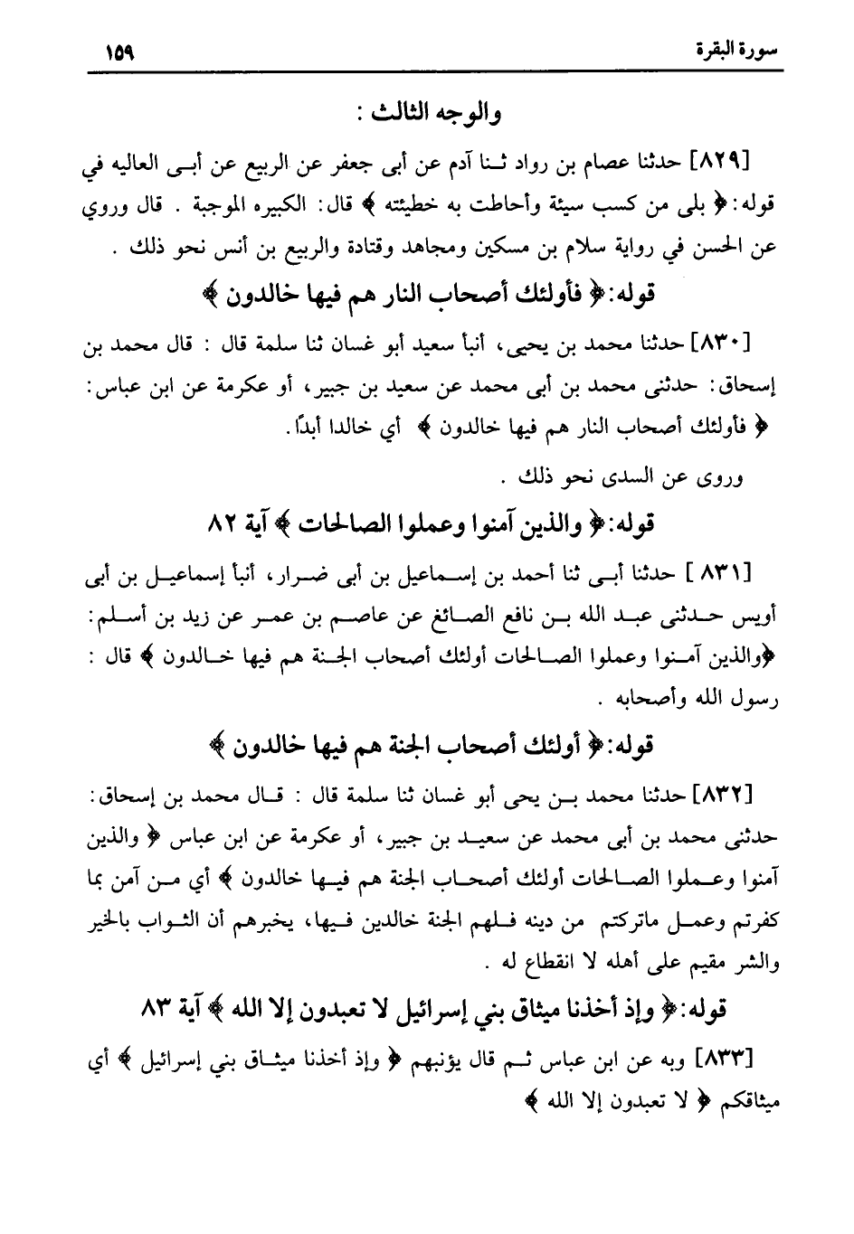 829 - حَدَّثَنَا عِصَامُ بْنُ رَوَّادٍ ثنا آدَمُ عَنْ أَبِي جَعْفَرٍ عَنِ الرَّبِيعِ عَنْ أَبِي الْعَالِيَةِ فِي قَوْلِهِ: بَلَى مَنْ كَسَبَ سَيِّئَةً وَأَحَاطَتْ بِهِ خَطِيئَتُهُ قَالَ: الْكَبِيرَةُ الْمُوجِبَةُ. قَالَ وَرُوِيَ عَنِ الْحَسَنِ فِي رِوَايَةِ سَلامِ بْنِ مِسْكِينٍ وَمُجَاهِدٍ وَقَتَادَةَ وَالرَّبِيعِ بْنِ أَنَسٍ نَحْوُ ذَلِكَ.