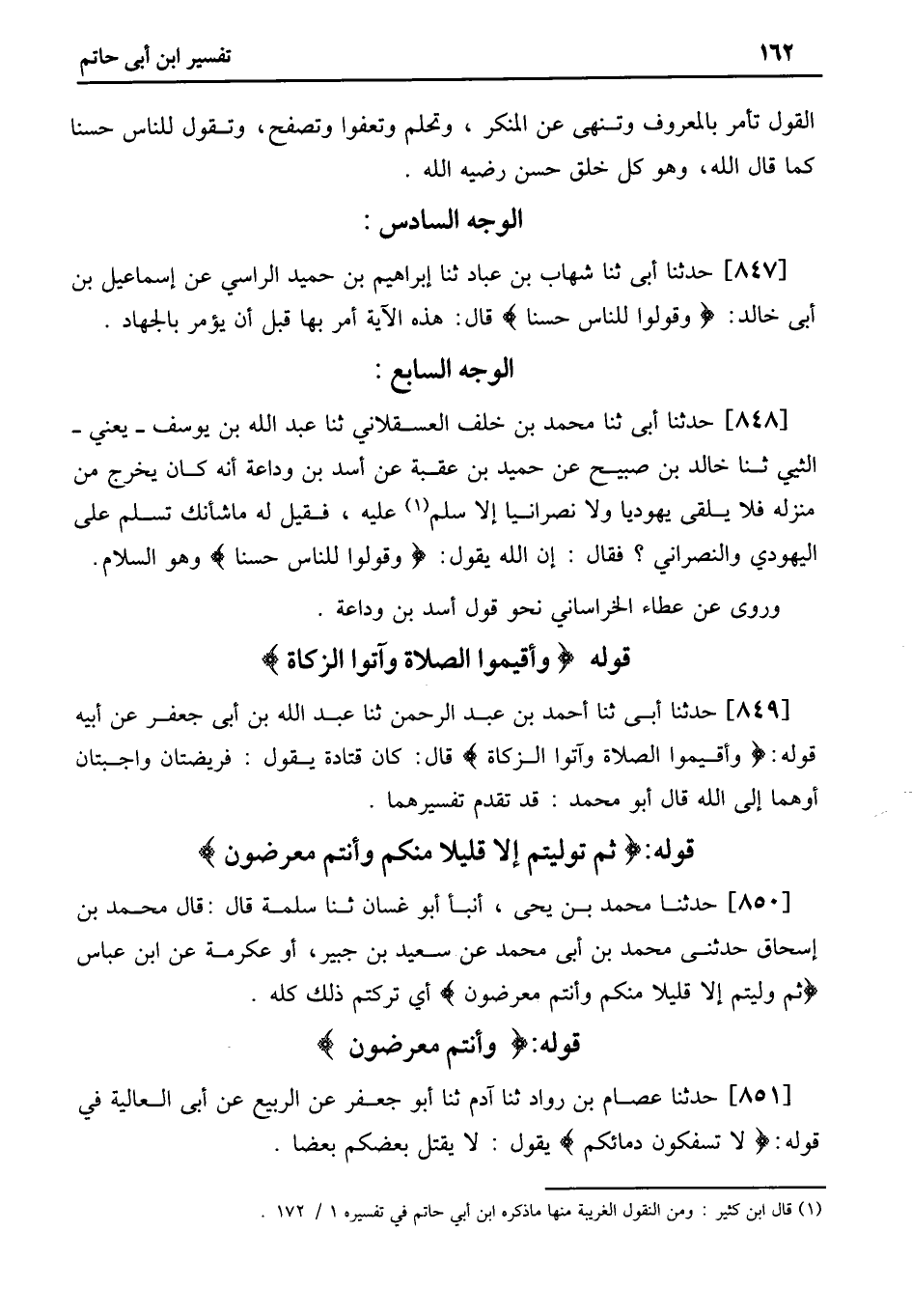 847 - حَدَّثَنَا أَبِي ثنا شِهَابُ بْنُ عَبَّادٍ ثنا إِبْرَاهِيمُ بْنُ حميد الراسي عَنْ إِسْمَاعِيلَ بْنِ أَبِي خَالِدٍ: وَقُولُوا لِلنَّاسِ حُسْنًا قَالَ: هَذِهِ الآيَةُ أُمِرَ بِهَا قَبْلَ أَنْ يُؤْمَرُ بِالْجِهَادِ.