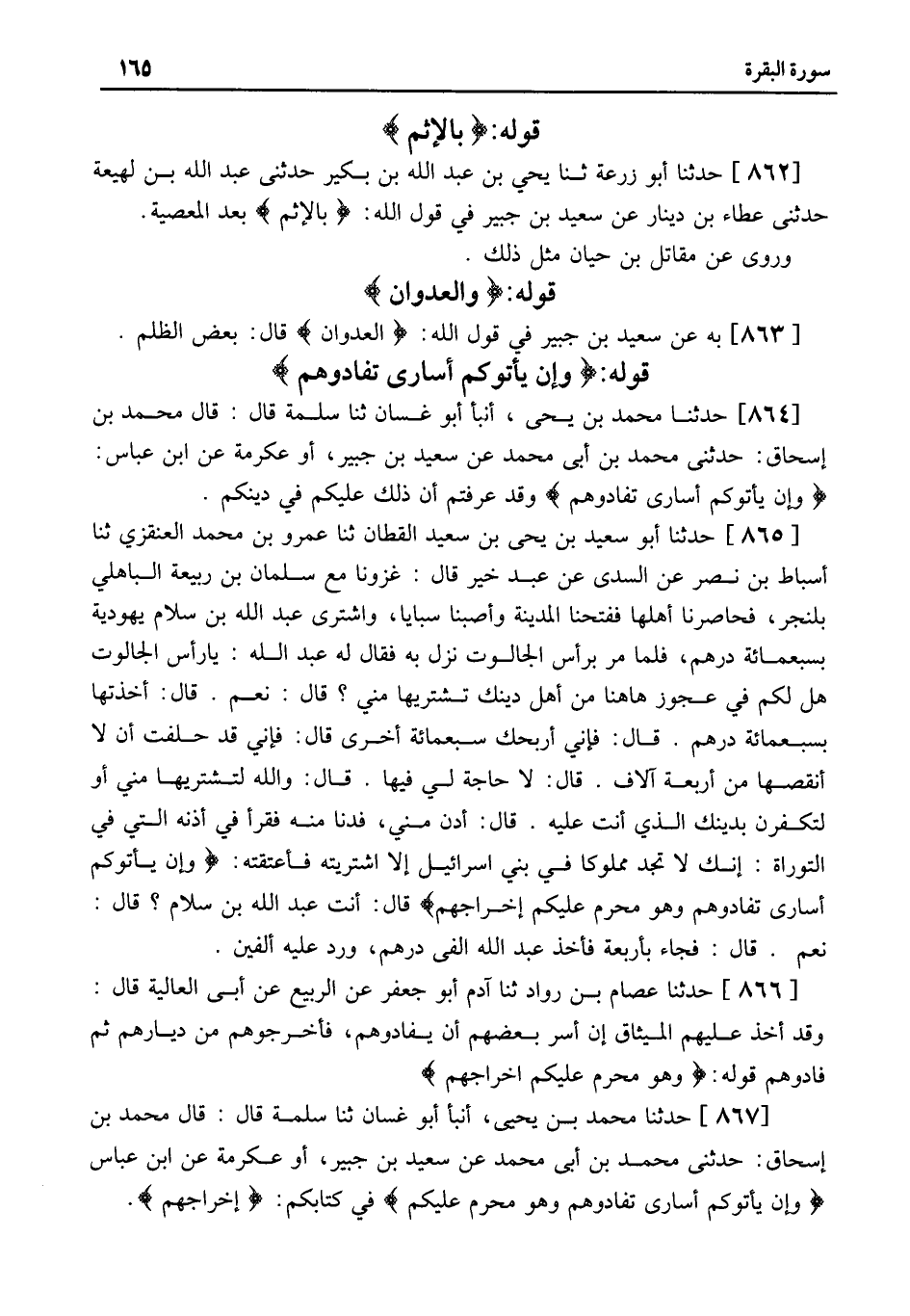 867 - حَدَّثَنَا مُحَمَّدُ بْنُ يَحْيَى، أَنْبَأَ أَبُو غَسَّانَ ثنا سَلَمَةُ قَالَ: قَالَ مُحَمَّدُ بْنُ إِسْحَاقَ: حَدَّثَنِي مُحَمَّدُ بْنُ أَبِي مُحَمَّدٍ عَنْ سَعِيدِ بْنِ جُبَيْرٍ، أَوْ عِكْرِمَةَ عَنِ ابْنِ عَبَّاسٍ وَإِنْ يَأْتُوكُمْ أُسَارَى تُفَادُوهُمْ وَهُوَ مُحَرَّمٌ عَلَيْكُمْ