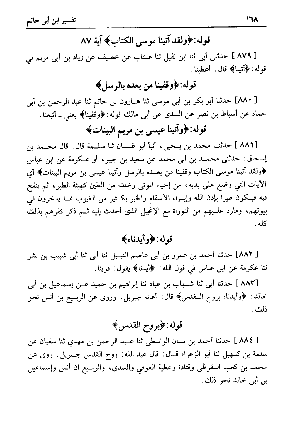 883 - حَدَّثَنَا أَبِي ثنا شِهَابُ بْنُ عَبَّادٍ ثنا إِبْرَاهِيمُ بْنُ حُمَيْدٍ عَنْ إِسْمَاعِيلَ بْنِ أَبِي خَالِدٍ: وَأَيَّدْنَاهُ بِرُوحِ الْقُدُسِ قَالَ: أَعَانَهُ جِبْرِيلُ. وَرُوِيَ عَنِ الرَّبِيعِ بْنِ أَنَسٍ نَحْوُ ذَلِكَ.