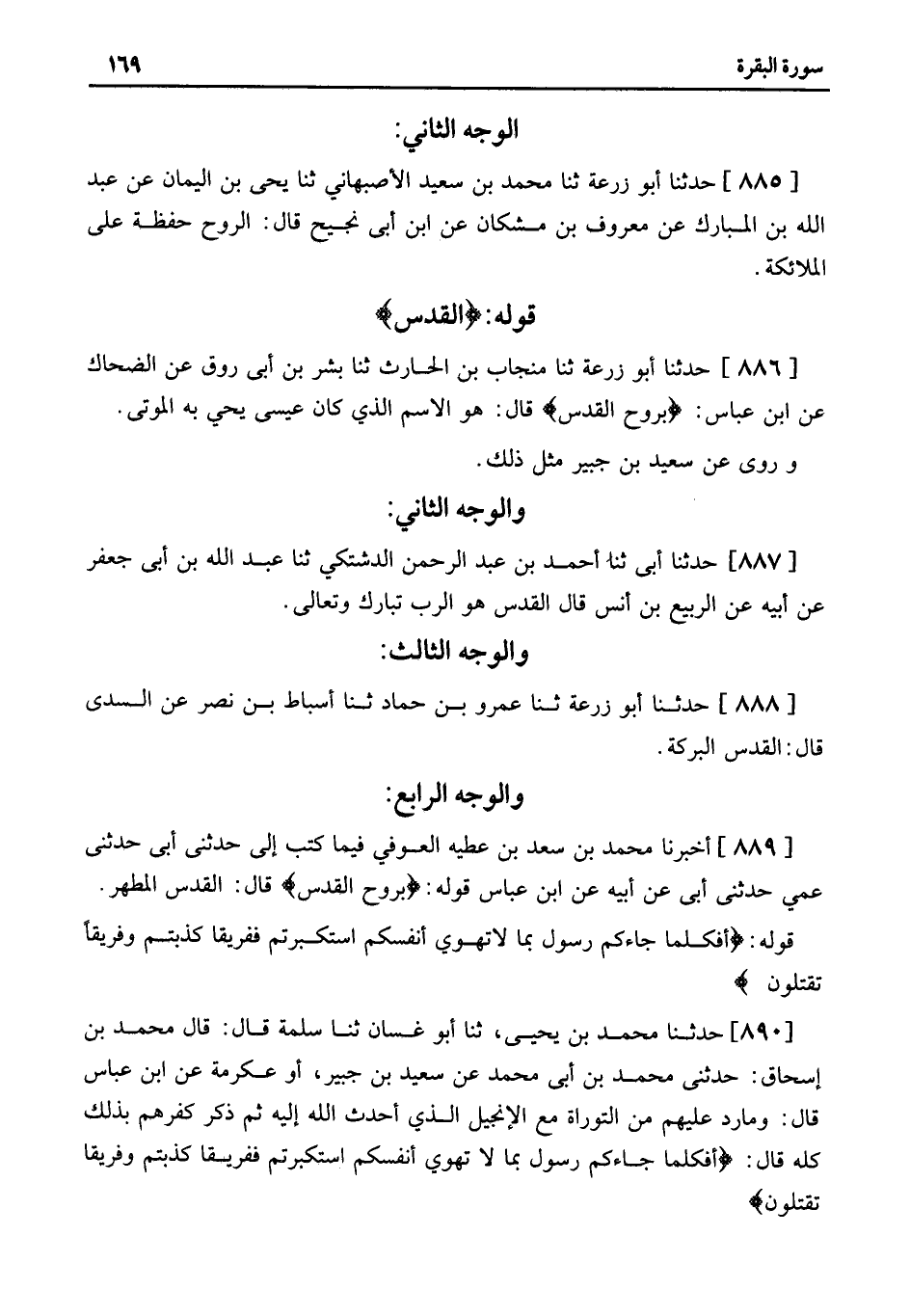 889 - أَخْبَرَنَا مُحَمَّدُ بْنُ سَعْدِ بْنِ عَطِيَّةَ الْعَوْفِيُّ فِيمَا كَتَبَ إِلَيَّ حَدَّثَنِي أَبِي حَدَّثَنِي عَمِّي حَدَّثَنِي أَبِي عَنْ أَبِيهِ عَنِ ابْنِ عَبَّاسٍ قَوْلُهُ: بِرُوحِ الْقُدُسِ قَالَ: الْقُدُسُ الْمُطَهَّرُ.