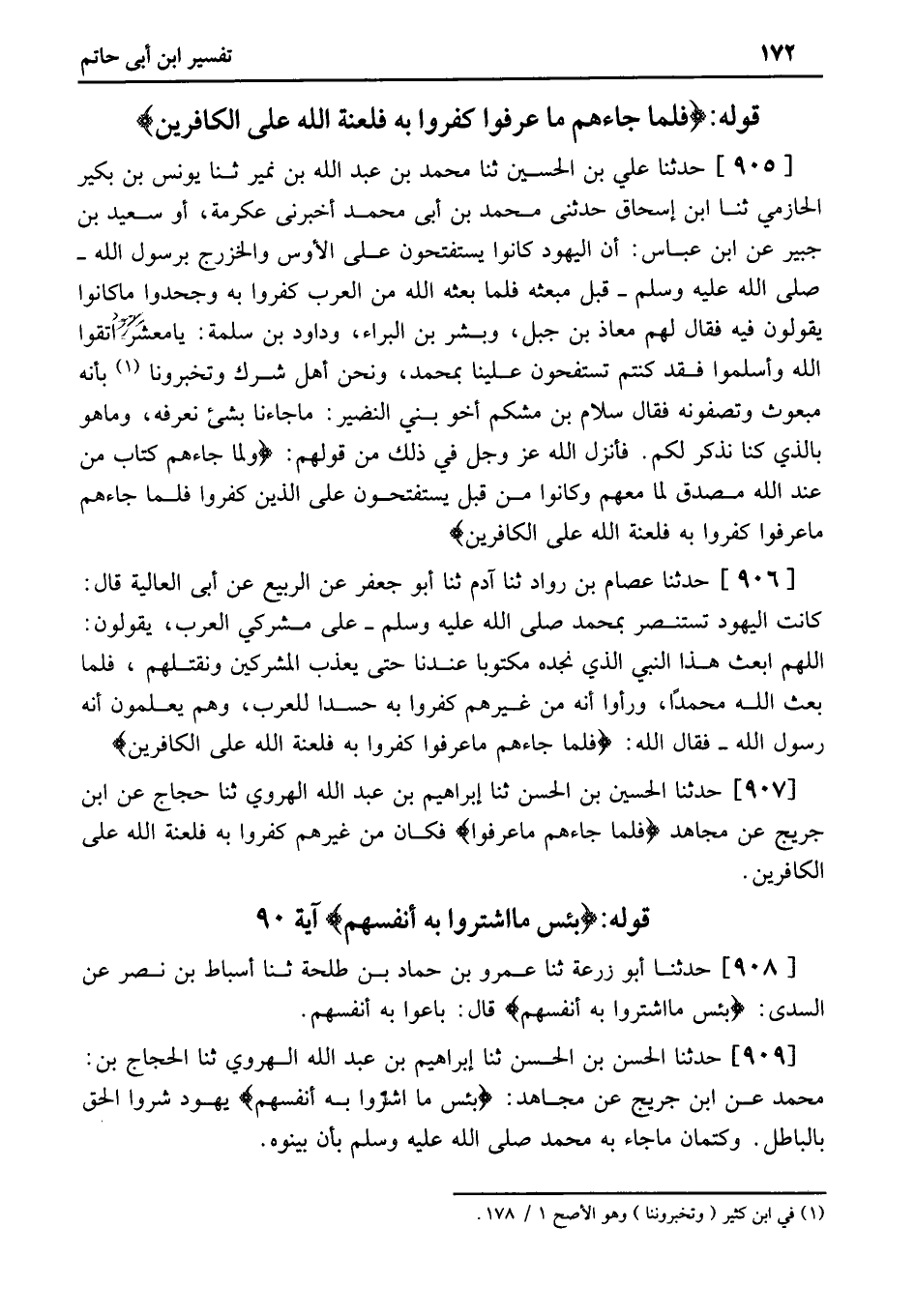 907 - حَدَّثَنَا الْحُسَيْنُ بْنُ الْحَسَنِ ثنا إِبْرَاهِيمُ بْنُ عَبْدِ اللَّهِ الْهَرَوِيُّ ثنا حَجَّاجٌ عَنِ ابْنِ جُرَيْجٍ عَنْ مُجَاهِدٍ فَلَمَّا جَاءَهُمْ مَا عَرَفُوا فَكَانَ مَنْ غَيْرِهِمْ كَفَرُوا بِهِ فَلَعْنَةُ اللَّهُ عَلَى الْكَافِرِينَ.