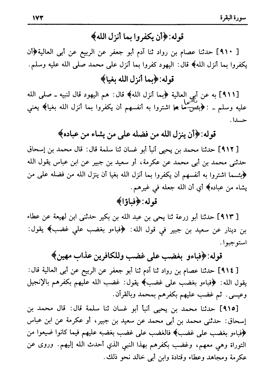 911 - بِهِ عَنْ أَبِي الْعَالِيَةِ بِمَا أَنْزَلَ اللَّهُ قَالَ: هُمُ الْيَهُودُ قَالَ لِنَبِيِّهِ- صَلَّى اللَّهُ عَلَيْهِ وَسَلَّمَ-: بِئْسَمَا اشْتَرَوْا بِهِ أَنْفُسَهُمْ أَنْ يَكْفُرُوا بِمَا أَنْزَلَ اللَّهُ بَغْيًا يَعْنِي حَسَدًا.