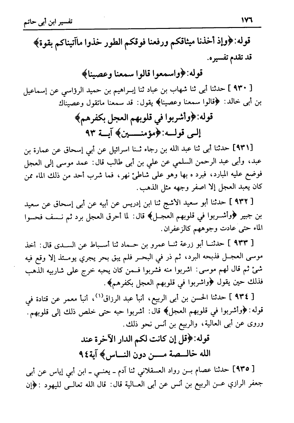 933 - حَدَّثَنَا أَبُو زُرْعَةَ ثنا عَمْرُو بْنُ حَمَّادٍ ثنا أَسْبَاطٌ عَنِ السُّدِّيِّ قَالَ: أَخَذَ مُوسَى الْعِجْلَ فَذَبَحَهُ الْبَرْدَ، ثُمَّ ذُرَّ فِي الْبَحْرِ فَلَمْ يَبْقَ بَحْرٌ يَجْرِي يَوْمَئِذٍ إِلا وَقَعَ فِيهِ شَيْءٌ ثُمَّ قَالَ لَهُمْ مُوسَى: اشْرَبُوا مِنْهُ فَشَرِبُوا فَمَنْ كَانَ يُحِبُّهُ خَرَجَ عَلَى شَارِبَيْهِ الذَّهَبُ فَذَلِكَ حِينَ يَقُولُ وَأُشْرِبُوا فِي قُلُوبِهِمُ الْعِجْلَ بِكُفْرِهِمْ.