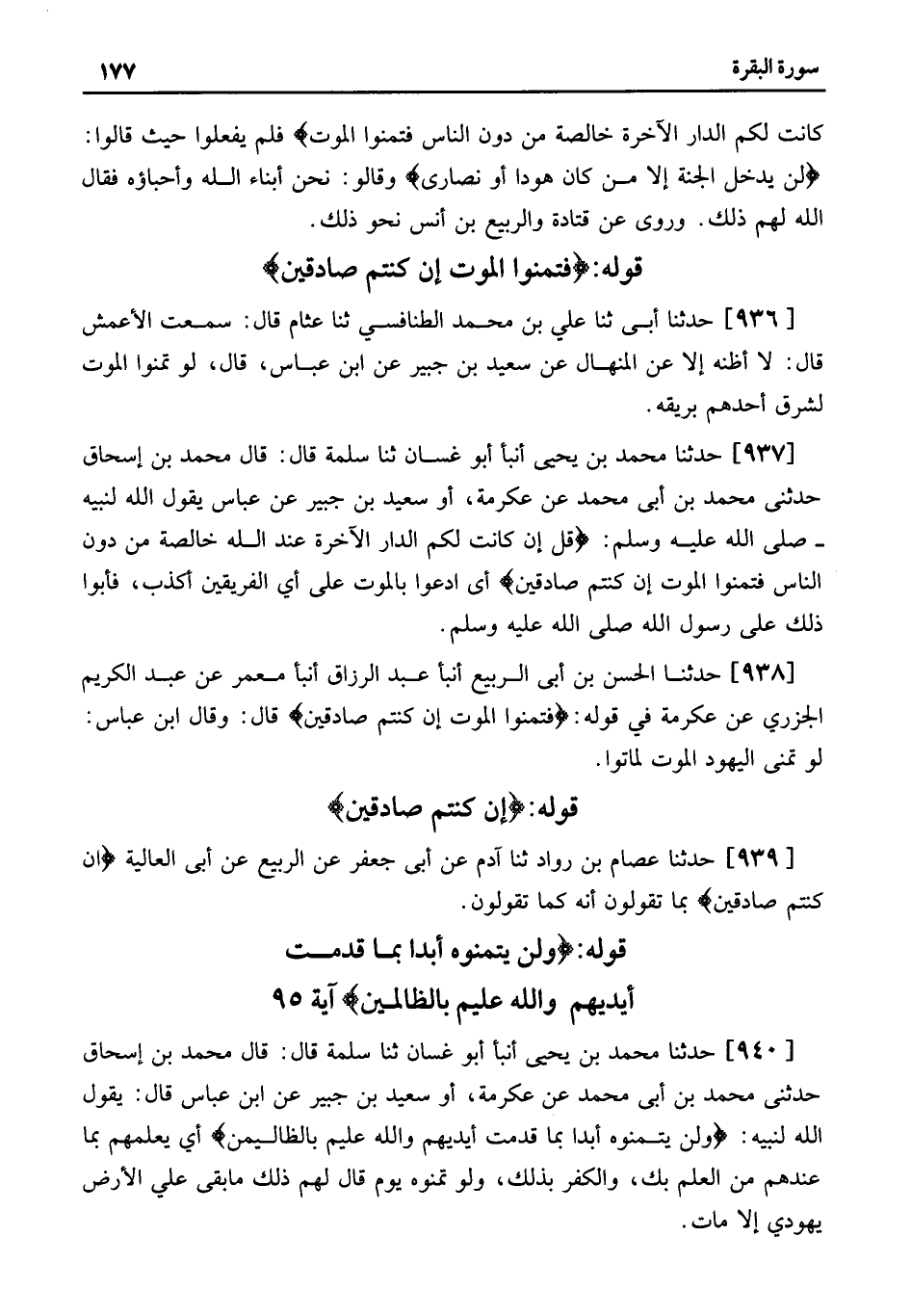 937 - حَدَّثَنَا مُحَمَّدُ بْنُ يَحْيَى أَنْبَأَ أَبُو غَسَّانَ ثنا سَلَمَةُ قَالَ: قَالَ مُحَمَّدُ بْنُ إِسْحَاقَ حَدَّثَنِي مُحَمَّدُ بْنُ أَبِي مُحَمَّدٍ عَنْ عِكْرِمَةَ، أَوْ سَعِيدِ بْنِ جُبَيْرٍ عَنِ (ابْنِ) عَبَّاسٍ يَقُولُ اللَّهُ لِنَبِيِّهِ- صَلَّى اللَّهُ عَلَيْهِ وَسَلَّمَ: قُلْ إِنْ كَانَتْ لَكُمُ الدَّارُ الْآخِرَةُ عِنْدَ اللَّهِ خَالِصَةً مِنْ دُونِ النَّاسِ فَتَمَنَّوَا الْمَوْتَ إِنْ كُنْتُمْ صَادِقِينَ أَيِ ادْعُوا بِالْمَوْتِ عَلَى أَيِّ الْفَرِيقَيْنِ أَكْذَبَ، فَأَبَوْا ذَلِكَ عَلَى رَسُولِ اللَّهِ صَلَّى اللَّهُ عَلَيْهِ وَسَلَّمَ.