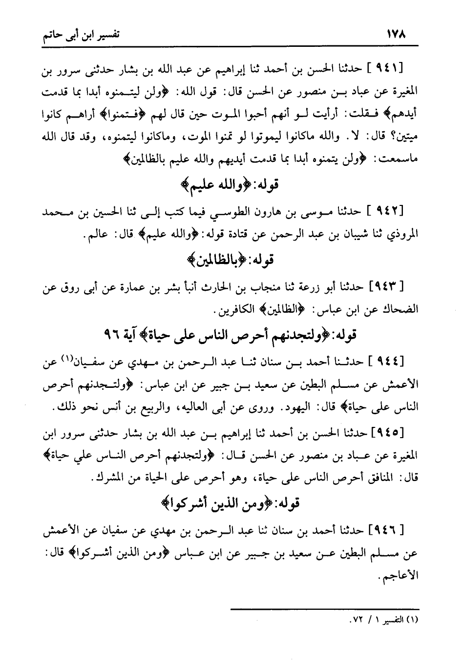 944 - حَدَّثَنَا أَحْمَدُ بْنُ سِنَانٍ ثنا عَبْدُ الرَّحْمَنِ بْنُ مَهْدِيٍّ عَنْ سُفْيَانَ «1» عَنِ الأَعْمَشِ عَنْ مُسْلِمٍ الْبَطِينِ عَنْ سَعِيدِ بْنِ جُبَيْرٍ عَنِ ابْنِ عَبَّاسٍ: وَلَتَجِدَنَّهُمْ أَحْرَصَ النَّاسِ عَلَى حَيَاةٍ قَالَ: الْيَهُودُ. وَرُوِيَ عَنْ أَبِي الْعَالِيَةِ، وَالرَّبِيعِ بْنِ أَنَسٍ نَحْوُ ذَلِكَ.
