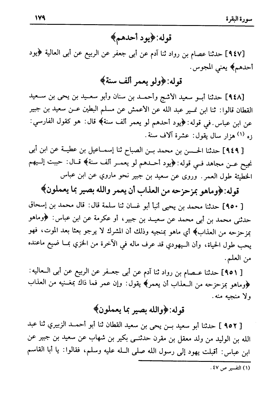 949 - حَدَّثَنَا الْحَسَنُ بْنُ مُحَمَّدِ بْنِ الصَّبَّاحِ ثنا إِسْمَاعِيلُ بْنُ عَطِيَّةَ عَنِ ابْنِ أَبِي نَجِيحٍ عَنْ مُجَاهِدٍ فِي قَوْلِهِ: يَوَدُّ أَحَدُهُمْ لَوْ يُعَمَّرُ أَلْفَ سَنَةٍ قَالَ: حُبِّبَتْ إِلَيْهِمُ الْخَطِيئَةُ طُولَ الْعُمُرِ. وَرُوِيَ عَنْ سَعِيدِ بْنِ جُبَيْرٍ نَحْوُ مَا رُوِيَ عَنِ ابْنِ عَبَّاسٍ