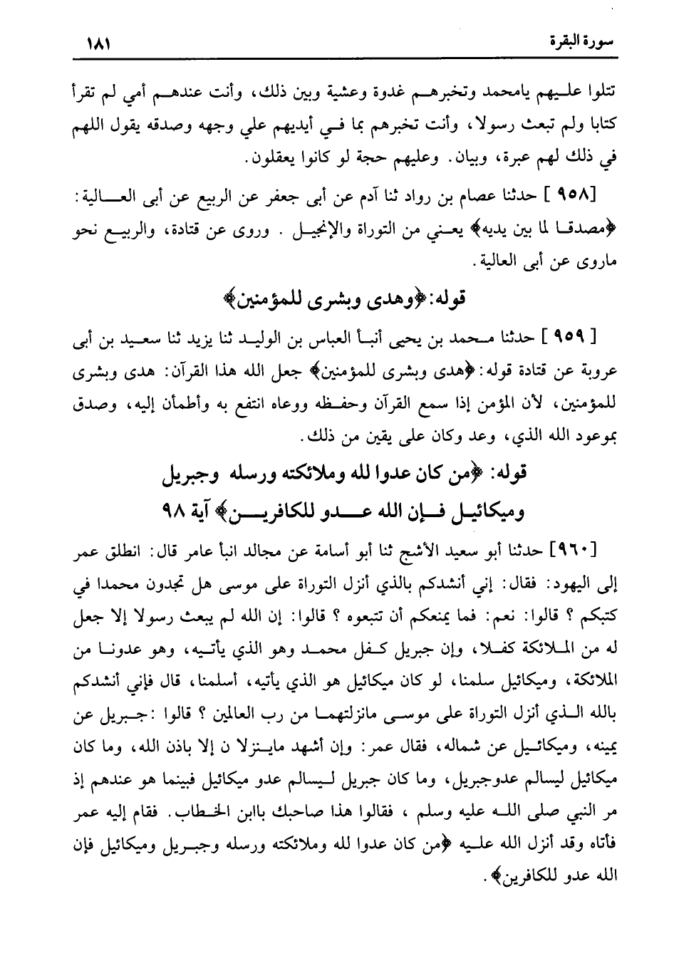 960 - حَدَّثَنَا أَبُو سَعِيدٍ الأَشَجُّ ثنا أَبُو أُسَامَةَ عَنْ مُجَالِدٍ أَنْبَأَ عَامِرٌ قَالَ: انْطَلَقَ عُمَرُ إِلَى الْيَهُودِ: فَقَالَ: إِنِّي أُنْشِدُكُمْ بِالذي أَنْزَلَ التَّوْرَاةَ عَلَى مُوسَى هَلْ تَجِدُونَ مُحَمَّدًا فِي كُتُبِكِمْ؟ قَالُوا: نَعَمْ: فَمَا يَمْنَعُكُمْ أَنْ تَتَّبِعُوهَ؟ قَالُوا: إِنَّ اللَّهَ لَمْ يَبْعَثْ رَسُولا إِلا جَعَلَ لَهُ مِنَ الْمَلائِكَةِ كِفْلا، وَإِنَّ جِبْرِيلَ كِفْلُ مُحَمَّدٍ وَهُوَ الَّذِي يَأْتِيهِ، وَهُوَ عَدُوُّنَا مِنَ الْمَلائِكَةِ، وَمِيكَائِيلُ سِلْمُنَا، لَوْ كَانَ مِيكَائِيلُ هُوَ الَّذِي يَأْتِيهِ، أَسْلَمْنَا، قَالَ فَإِنِّي أُنْشِدُكُمْ بِاللَّهِ الَّذِي أَنْزَلَ التَّوْرَاةَ عَلَى مُوسَى مَا نَزْلَتُهُمَا مِنْ رَبِّ الْعَالَمِينَ؟ قَالُوا: جِبْرِيلُ عَنْ يَمِينِهِ، وَمِيكَائِيلُ عَنْ شماله، فقال عمر: وإن أَشْهَدُ مَا يَنْزِلانِ إِلا بِإِذْنِ اللَّهِ، وَمَا كَانَ مِيكَائِيلُ لِيُسَالِمَ عَدُوَّ جِبْرِيلَ، وَمَا كَانَ جِبْرِيلُ لِيُسَالِمَ عَدُوَّ مِيكَائِيلَ فَبَيْنَمَا هُوَ عِنْدَهُمْ إِذْ مَرَّ النَّبِيُّ صَلَّى اللَّهُ عَلَيْهِ وَسَلَّمَ، فقالوا هذا صاحبك با ابْنَ الْخَطَّابِ. فَقَامَ إِلَيْهِ عُمَرُ فَأَتَاهُ وَقَدْ أَنْزَلَ اللَّهُ عَلَيْهِ مَنْ كَانَ عَدُوًّا لِلَّهِ وَمَلَائِكَتِهِ وَرُسُلِهِ وَجِبْرِيلَ وَمِيكَالَ فَإِنَّ اللَّهَ عَدُوٌّ للكافرين.