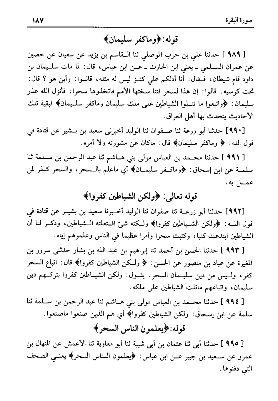 993 - حَدَّثَنَا الْحَسنُ بْنُ أَحْمَدَ ثنا إِبْرَاهِيمُ بْنُ عَبْدِ اللَّهِ بْنِ بَشَّارٍ حَدَّثَنِي سُرُورُ بْنُ الْمُغِيرَةِ عَنْ عَبَّادِ بْنِ مَنْصُورٍ عَنِ الْحَسَنِ: وَلَكِنِ الشَّيَاطِينَ كَفَرُوا قَالَ: اتِّبَاعُ السِّحْرِ كُفْرٌ، وَلَيْسَ مِنْ دِينِ سُلَيْمَانَ السِّحْرُ. يَقُولُ: وَلَكِنَّ الشَّيَاطِينَ كَفَرُوا بِتَرْكِهِمْ دِينَ سُلَيْمَانَ، وَاتِّبَاعِهِمْ مَا تَلَتِ الشَّيَاطِينُ عَلَى مُلْكِهِ.