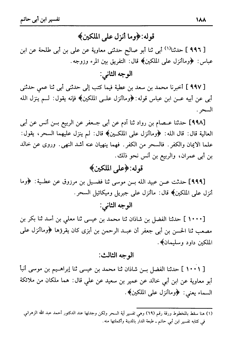 (1) . هنا سقط بالمخطوط ورقة رقم (69) وهي تفسير آية السحر ولكن وجدتها عند الدكتور أحمد عبد الله الزهراني في كتابه تفسير ابن أبي حاتم- طبعة الدار بالمدينة وأكملتها منه.