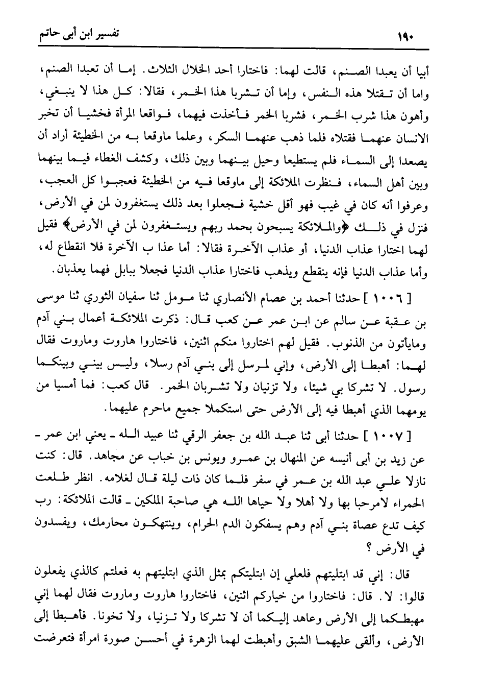 1006 - حَدَّثَنَا أَحْمَدُ بْنُ عِصَامٍ الأَنْصَارِيُّ ثنا مُؤَمَّلٌ ثنا سُفْيَانُ الثَّوْرِيُّ ثنا مُوسَى بْنُ عُقْبَةَ عَنْ سَالِمٍ عَنِ ابْنِ عُمَرَ عَنْ كَعْبٍ قَالَ: ذَكَرَتِ الْمَلائِكَةُ أَعْمَالَ بَنِي آدَمَ وَمَا يَأْتُونَ مِنَ الذُّنُوبِ. فَقِيلَ لَهُمُ اخْتَارُوا مِنْكُمُ اثْنَيْنِ، فَاخْتَارُوا هَارُوتَ وَمَارُوتَ فَقَالَ لَهُمَا: اهْبِطَا إِلَى الأَرْضِ، وَإِنِّي لَمُرْسِلٌ إِلَى بَنِي آدَمَ رُسُلا، وَلَيْسَ بَيْنِي وَبَيْنَكُمَا رَسُولٌ. لَا تُشْرِكَا بِي شَيْئًا، ولا تزنيان ولا تشربان الْخَمْرَ. قَالَ كَعْبٌ: فَمَا أَمْسَيَا مِنْ يَوْمِهِمَا الَّذِي أُهْبِطَا فِيهِ إِلَى الأَرْضِ حَتَّى اسْتَكْمَلا جَمِيعَ مَا حُرِّمَ عَلَيْهِمَا.