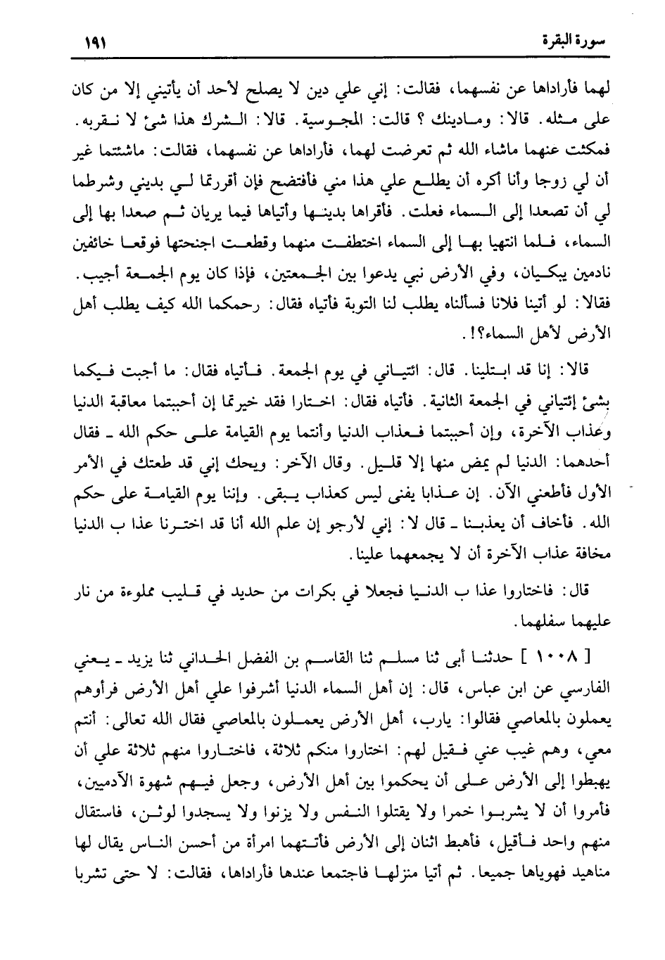 1008 - حَدَّثَنَا أَبِي ثنا مُسْلِمٌ ثنا الْقَاسِمُ بْنُ الْفَضْلِ الْحُدَّانِيُّ ثنا يَزِيدُ- يَعْنِي الْفَارِسِيَّ عَنِ ابْنِ عَبَّاسٍ، قَالَ: إِنَّ أَهْلَ السَّمَاءِ الدُّنْيَا أَشْرَفُوا عَلَى أَهْلِ الأَرْضِ فَرَأَوْهُمْ يَعْمَلُونَ بِالْمَعَاصِي فَقَالُوا: يَا رَبِّ، أَهْلُ الأَرْضِ يَعْمَلُونَ بِالْمَعَاصِي فَقَالَ اللَّهُ تَعَالَى: أَنْتُمْ مَعِي، وَهُمْ غُيَّبٌ عَنِّي فَقِيلَ لَهُمْ: اخْتَارُوا مِنْكُمْ ثَلاثَةً، فَاخْتَارُوا مِنْهُمْ ثَلاثَةً عَلَى أَنْ يَهْبِطُوا إِلَى الأَرْضِ عَلَى أَنْ يَحْكُمُوا بَيْنَ أَهْلِ الأَرْضِ، وَجَعَلَ فِيهِمْ شَهْوَةَ الآدَمَيِّينَ، فَأُمِرُوا أَنْ لَا يَشْرَبُوا خَمْرًا وَلا يَقْتُلُوا النَّفْسَ وَلا يَزْنُوا وَلا يَسْجُدُوا لِوَثَنٍ، فَاسْتَقَالَ مِنْهُمْ وَاحِدٌ فَأُقِيلَ، فَأُهْبِطَ اثْنَانِ إِلَى الأَرْضِ فَأَتَتْهُمَا امْرَأَةٌ مِنْ أَحْسَنِ النَّاسِ يُقَالُ لَهَا مَنَاهِيدُ فَهَوِيَاهَا جَمِيعًا. ثُمَّ أَتَيَا مَنْزِلَهَا فَاجْتَمَعَا عِنْدَهَا فَأَرَادَاهَا، فَقَالَتْ: لَا حتى تشربا