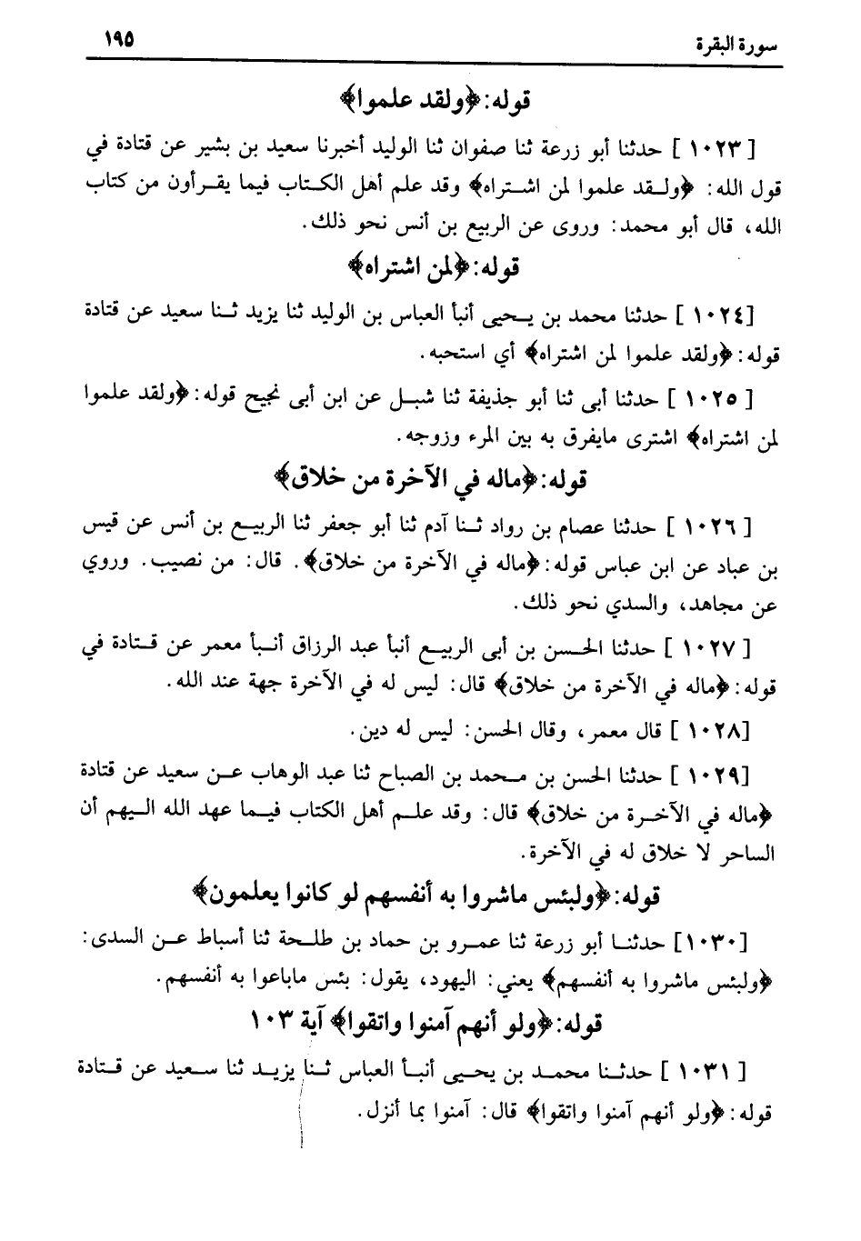 1023 - حَدَّثَنَا أَبُو زُرْعَةَ ثنا صَفْوَانُ ثنا الْوَلِيدُ أَخْبَرَنَا سَعِيدُ بْنُ بَشِيرٍ عَنْ قَتَادَةَ فِي قَوْلِ اللَّهِ: وَلَقَدْ عَلِمُوا لَمَنِ اشْتَرَاهُ وَقَدْ عَلِمَ أَهْلُ الْكِتَابِ فِيمَا يَقْرَءُونَ مِنْ كِتَابِ اللَّهِ، قَالَ أَبُو مُحَمَّدٍ: وَرُوِيَ عَنِ الرَّبِيعِ بْنِ أَنَسٍ نَحْوُ ذَلِكَ.